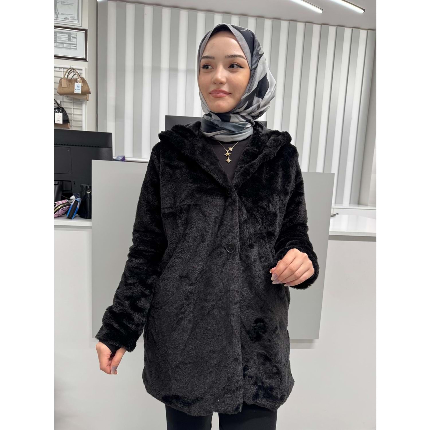 Kapşonlu Uzun Pelüş Kürk 2166 - Siyah - 40