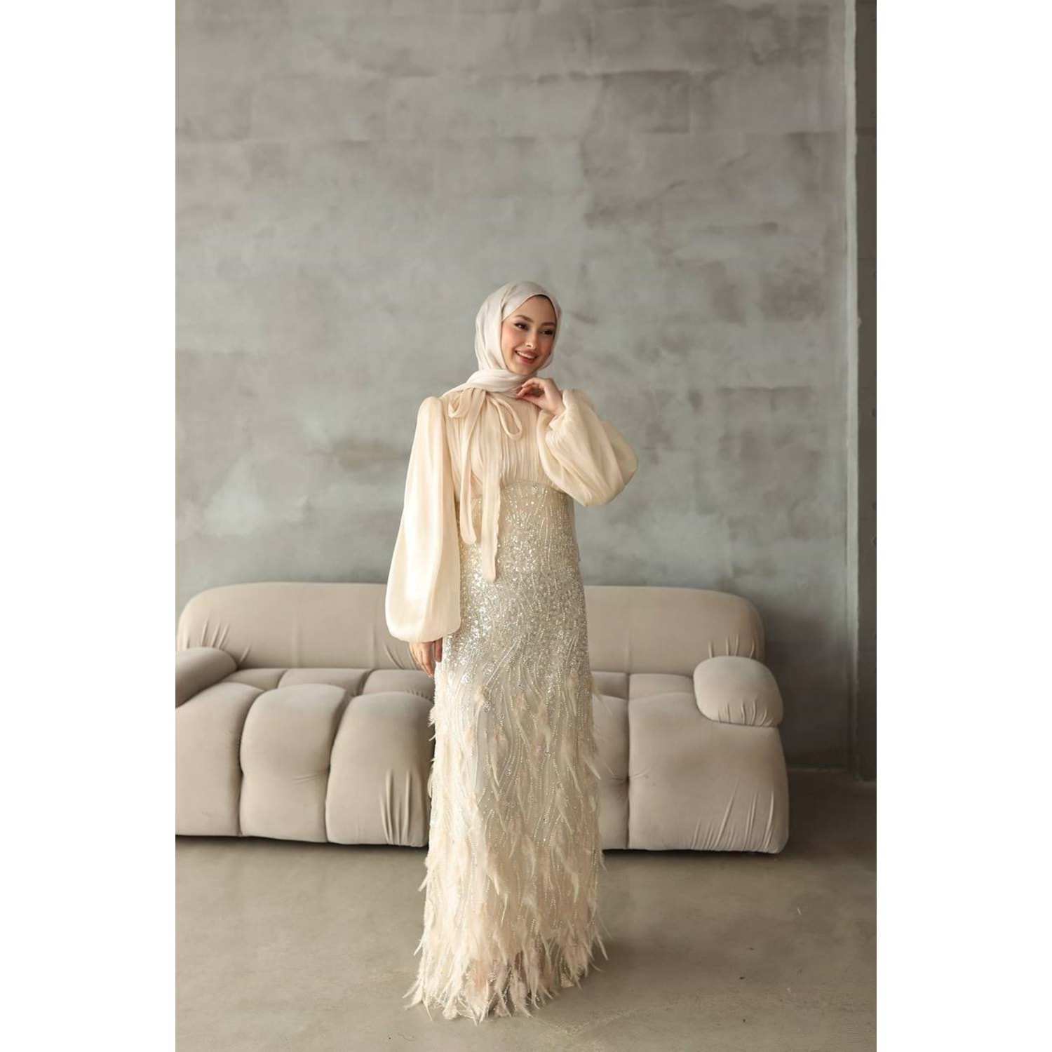 Etek Tüylü Taşlı Abiye Elbise 2974 - Bej - 40 - AZRA08350-65587