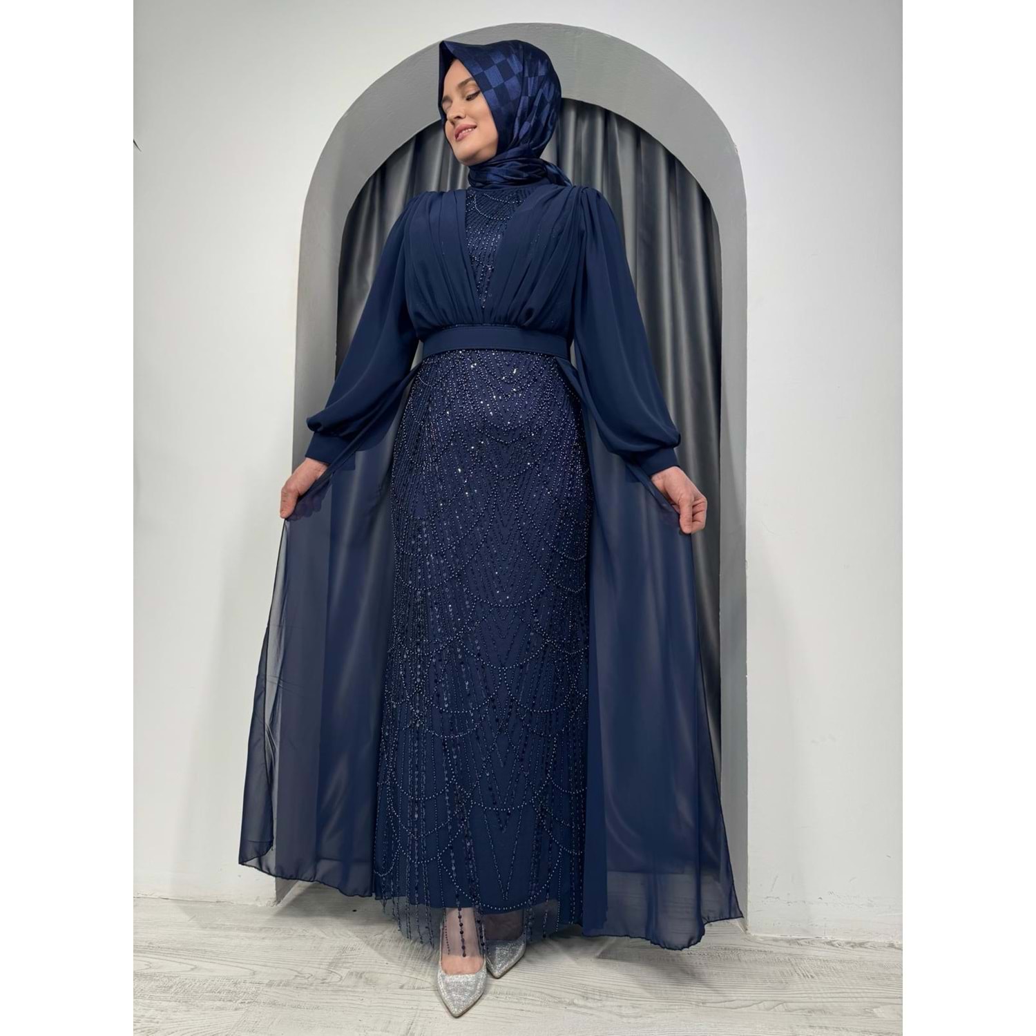 Önü Detaylı Pullu Abiye Elbise 4630 - Lacivert - 40