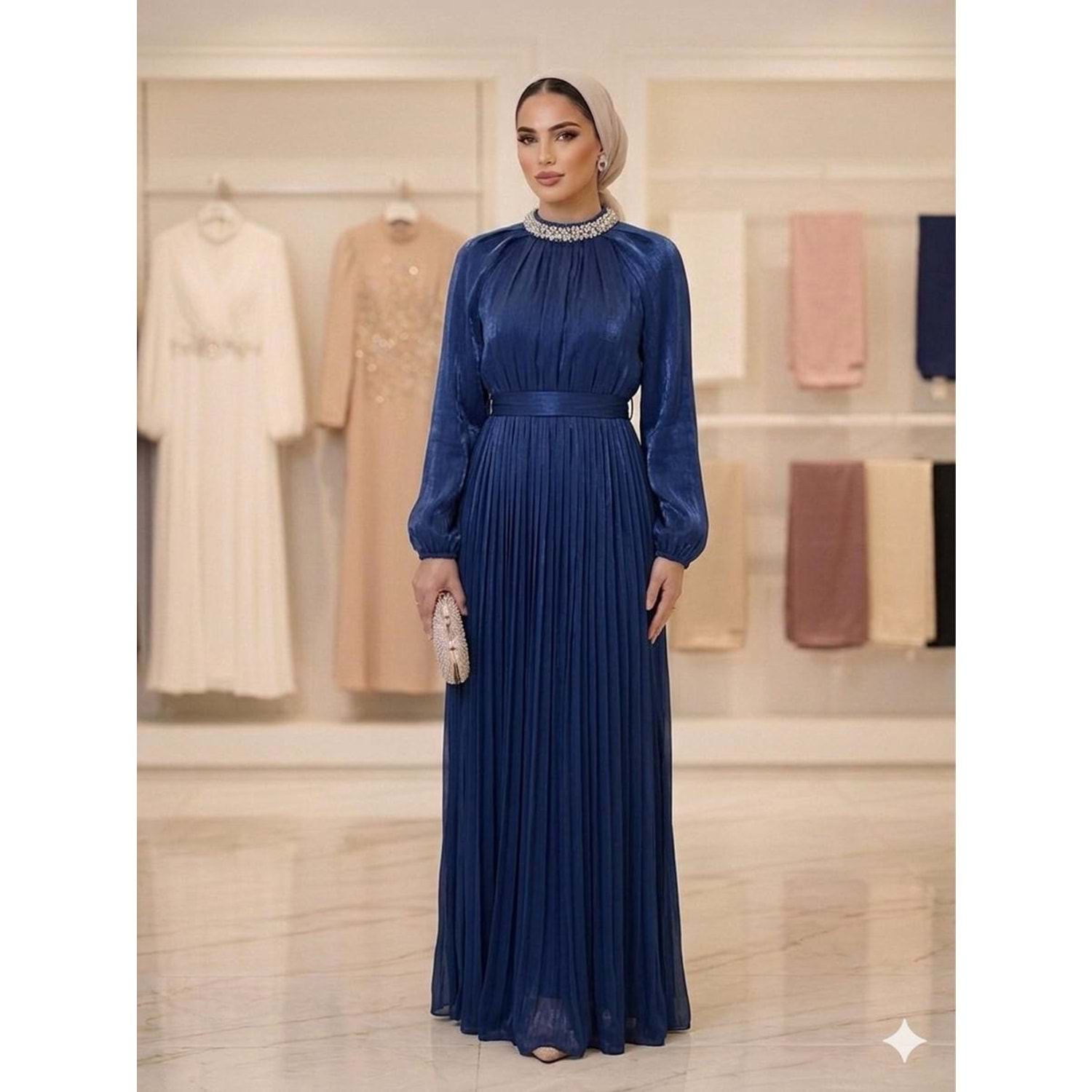 Taşlı Yaka İşlemeli Abiye Elbise af11 17001 - Lacivert - 40
