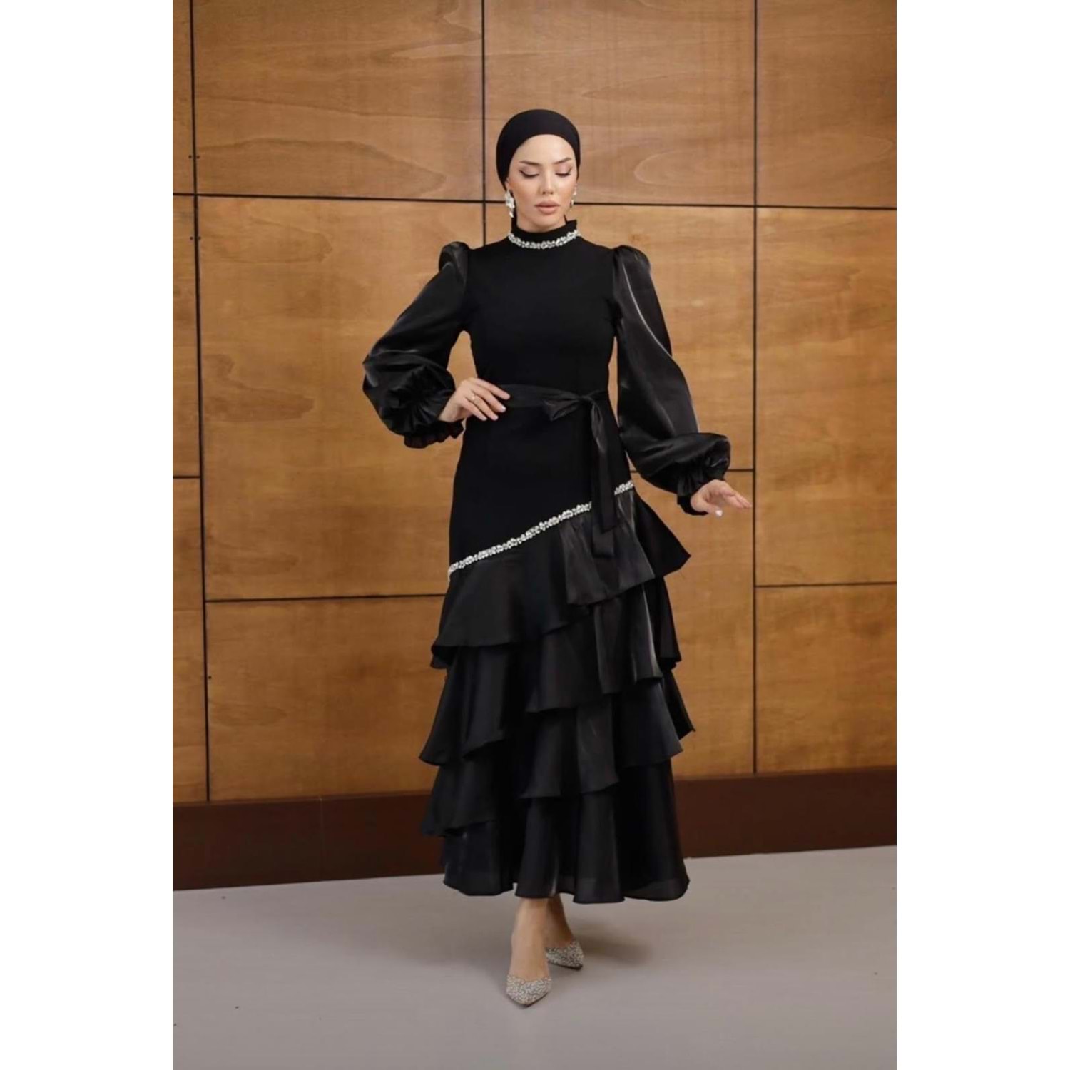 Yakası Taşlı Fırfırlı Abiye Elbise af11 4793 - Siyah - 46