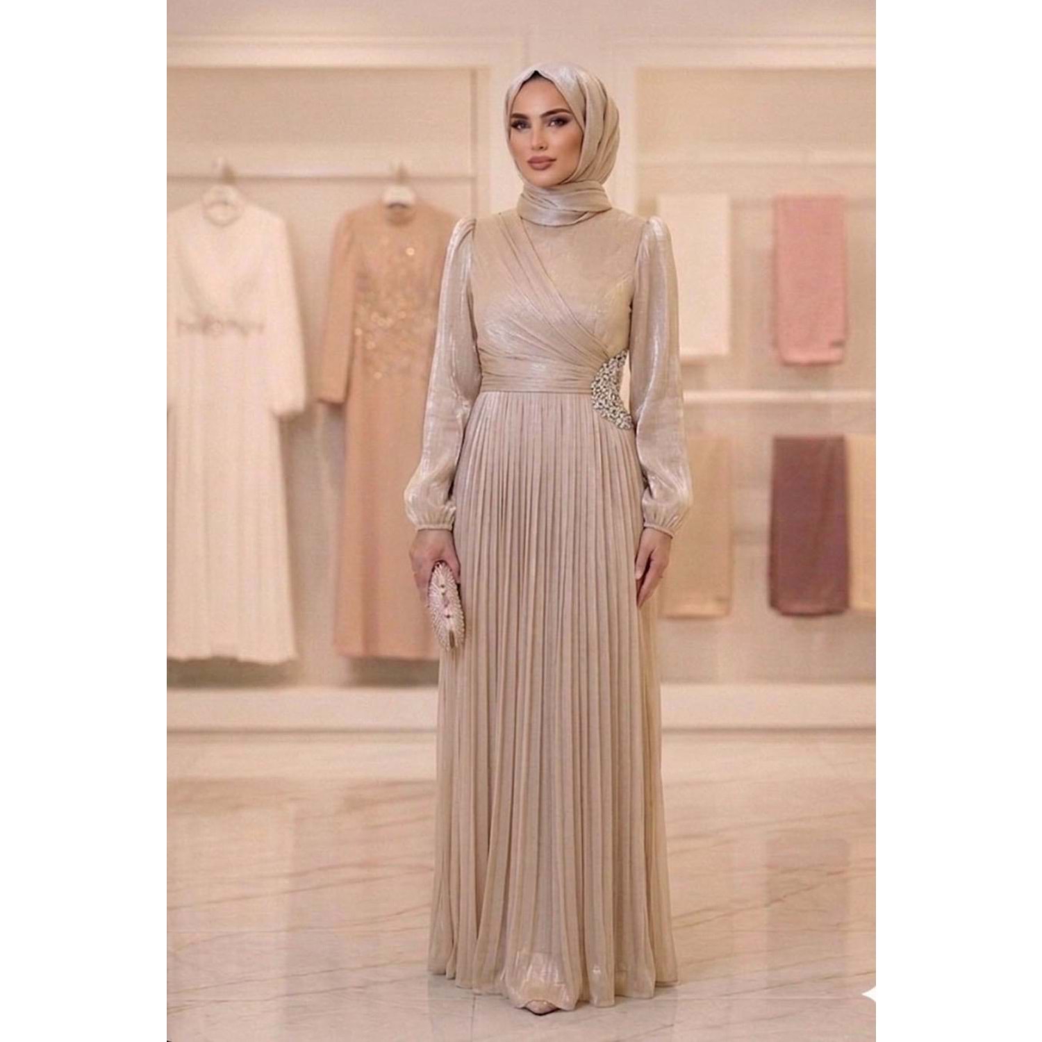 Yanı Taşlı Fırfırlı Abiye Elbise af11 17037 - Bej - 40