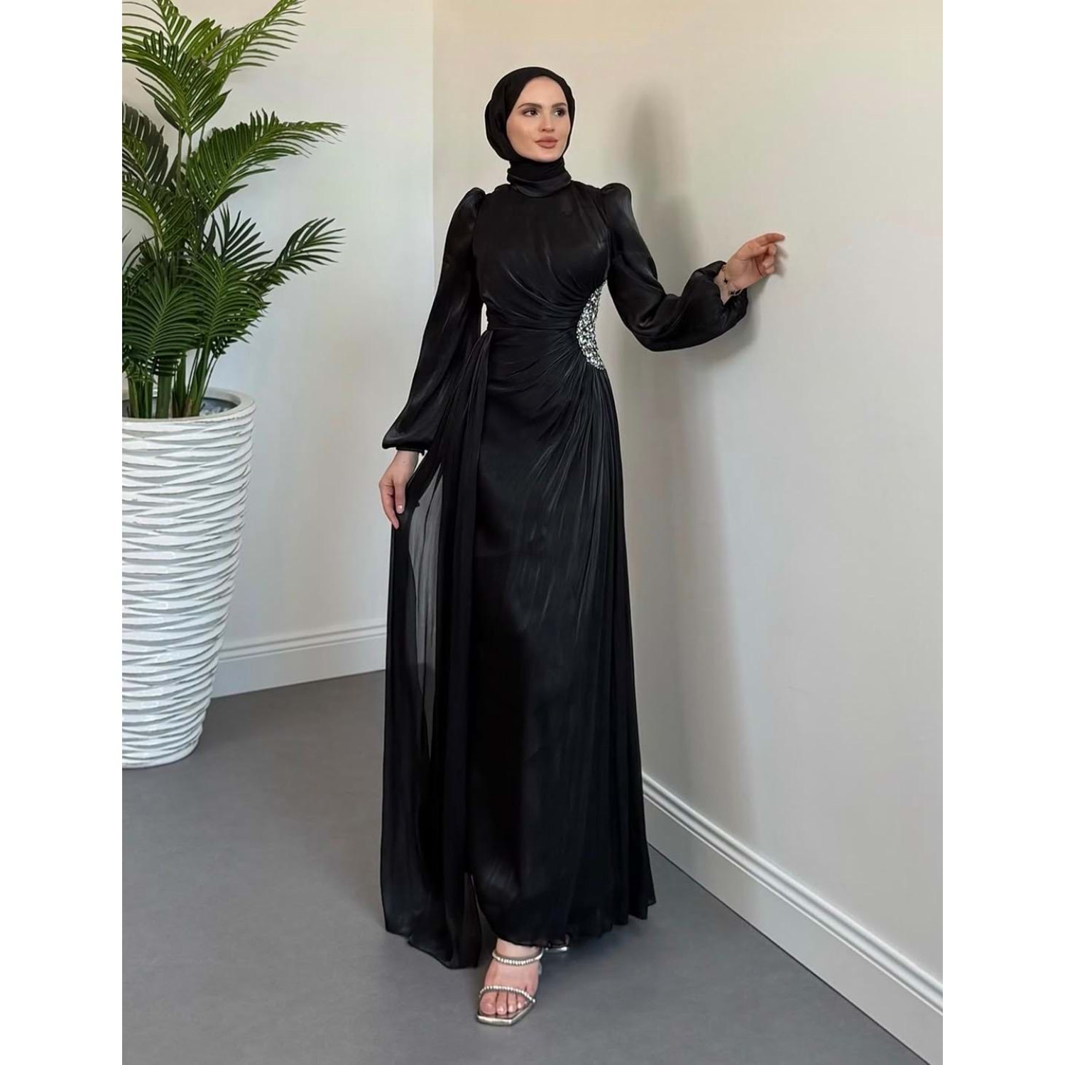 Yanı Taşlı Janjan Abiye Elbise af11 4756 - Siyah - 40