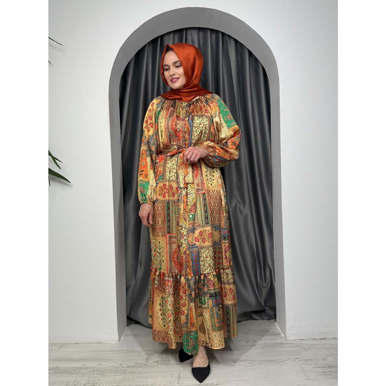 Desenli Saten Elbise 2315 - Sarı - TEK BEDEN