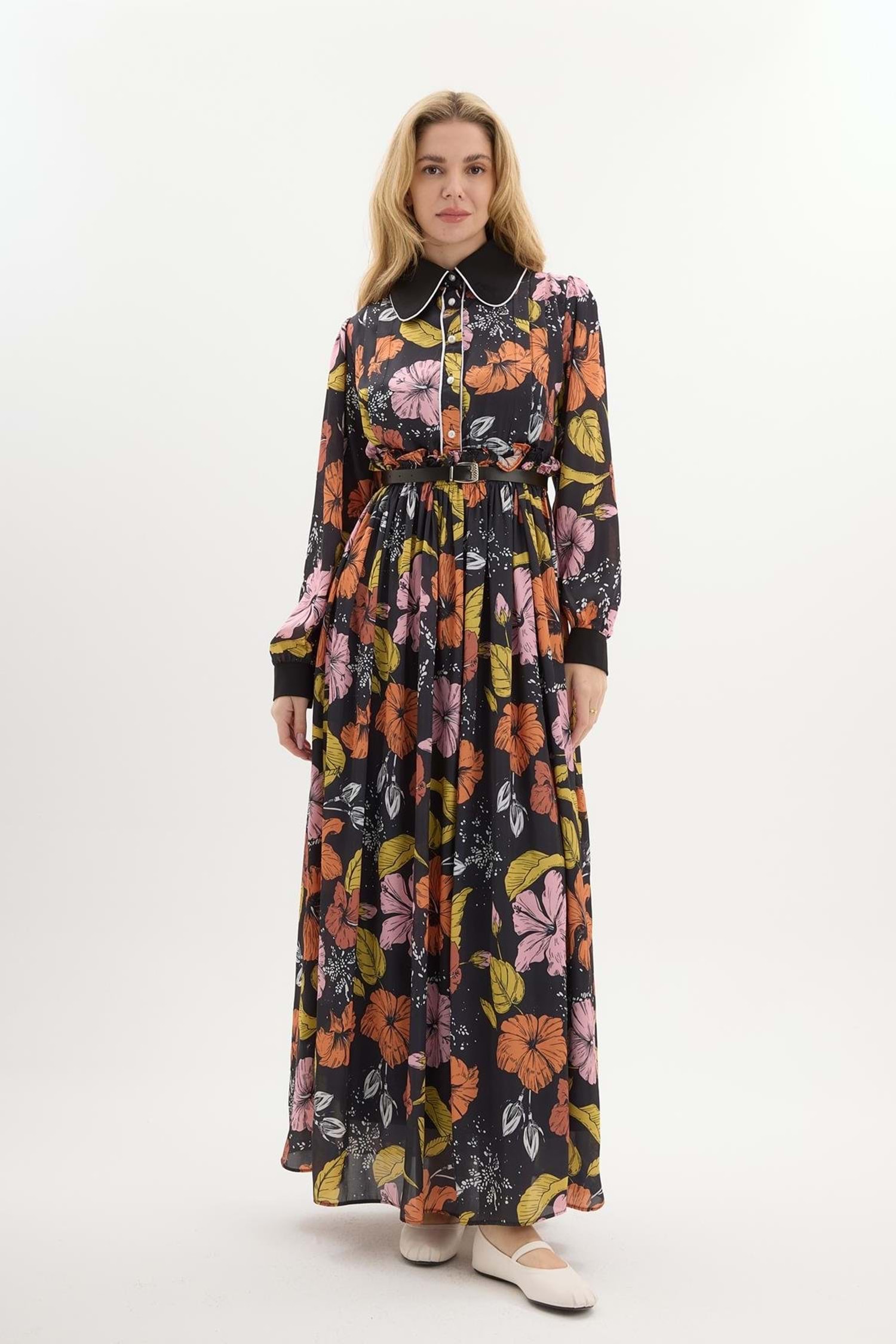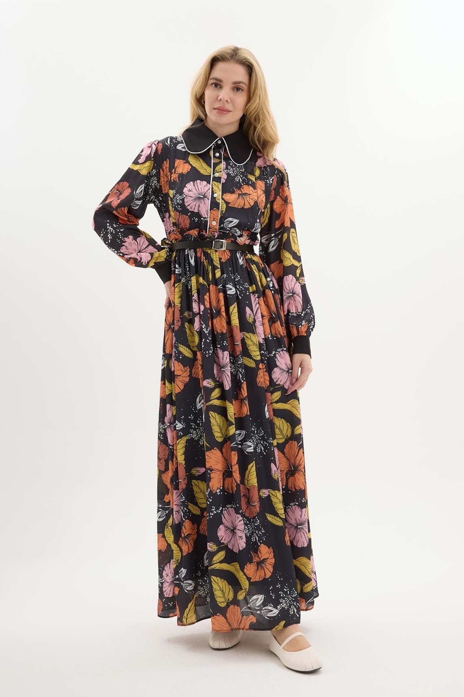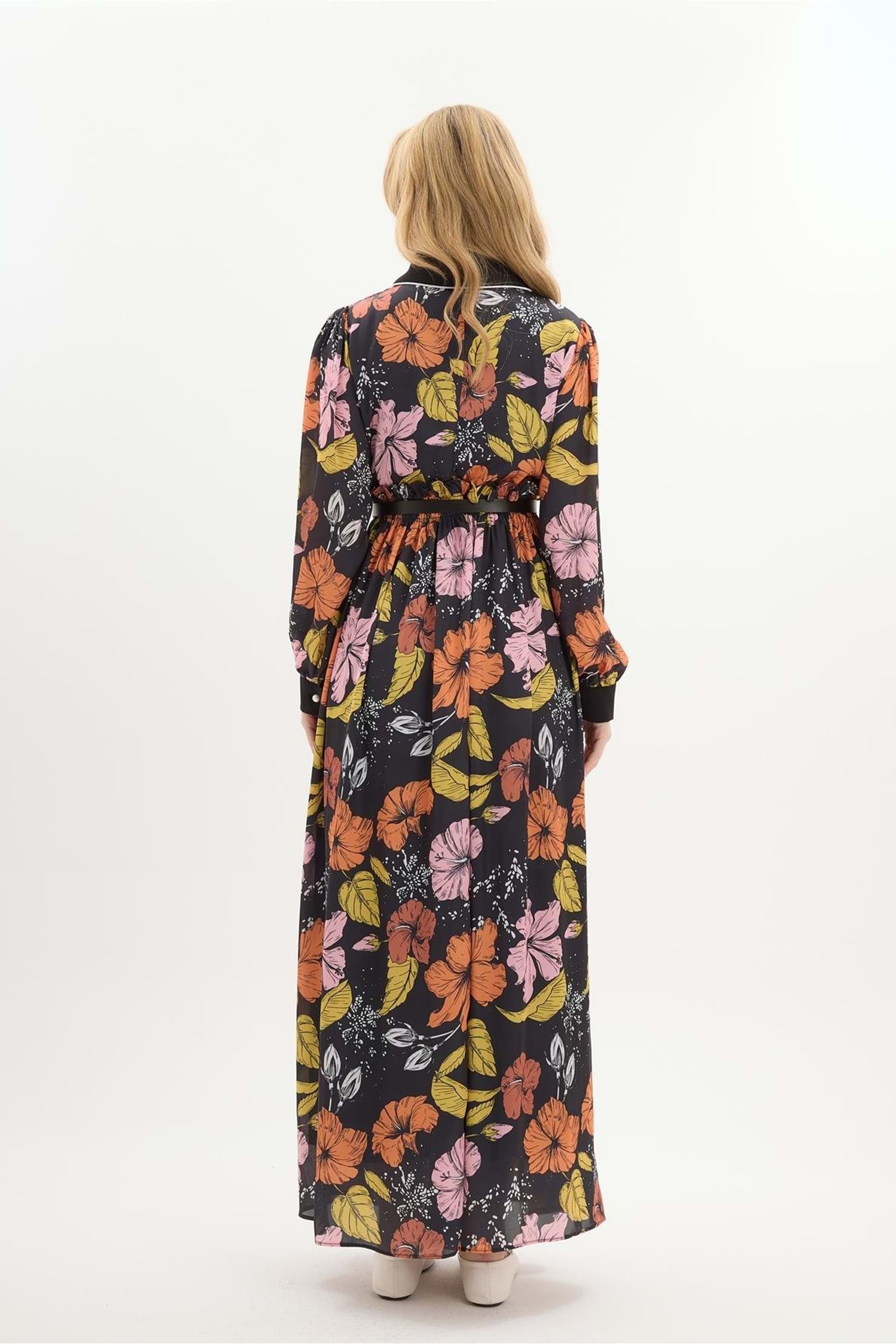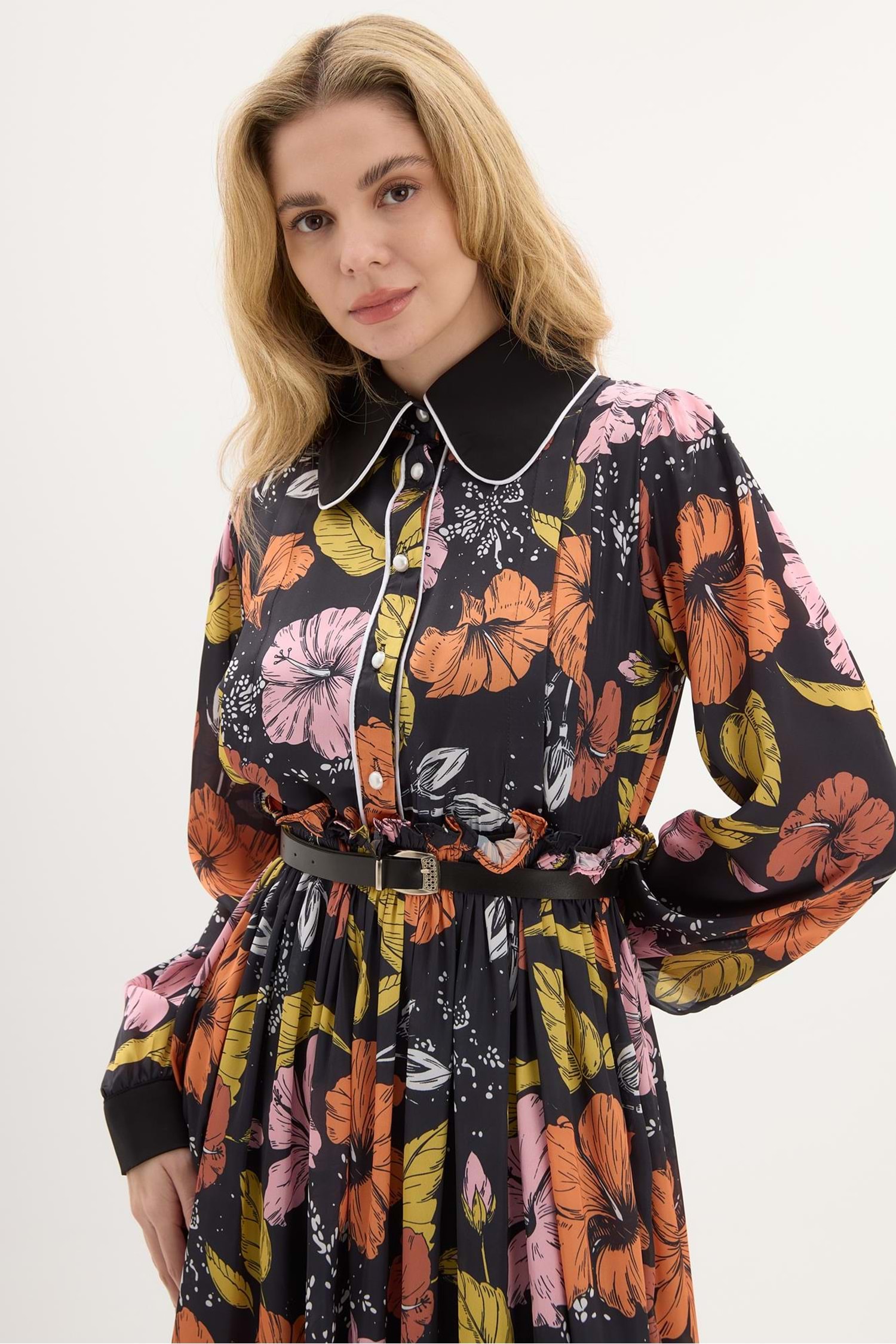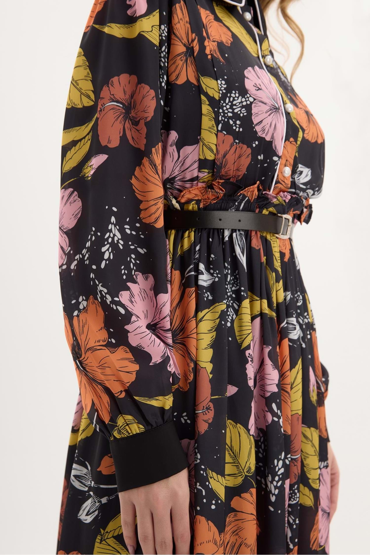Lucas Yaka Detaylı Çiçek Desenli Elbise 6199 - Turuncu - 36 - AZRA04087-Turuncu-36