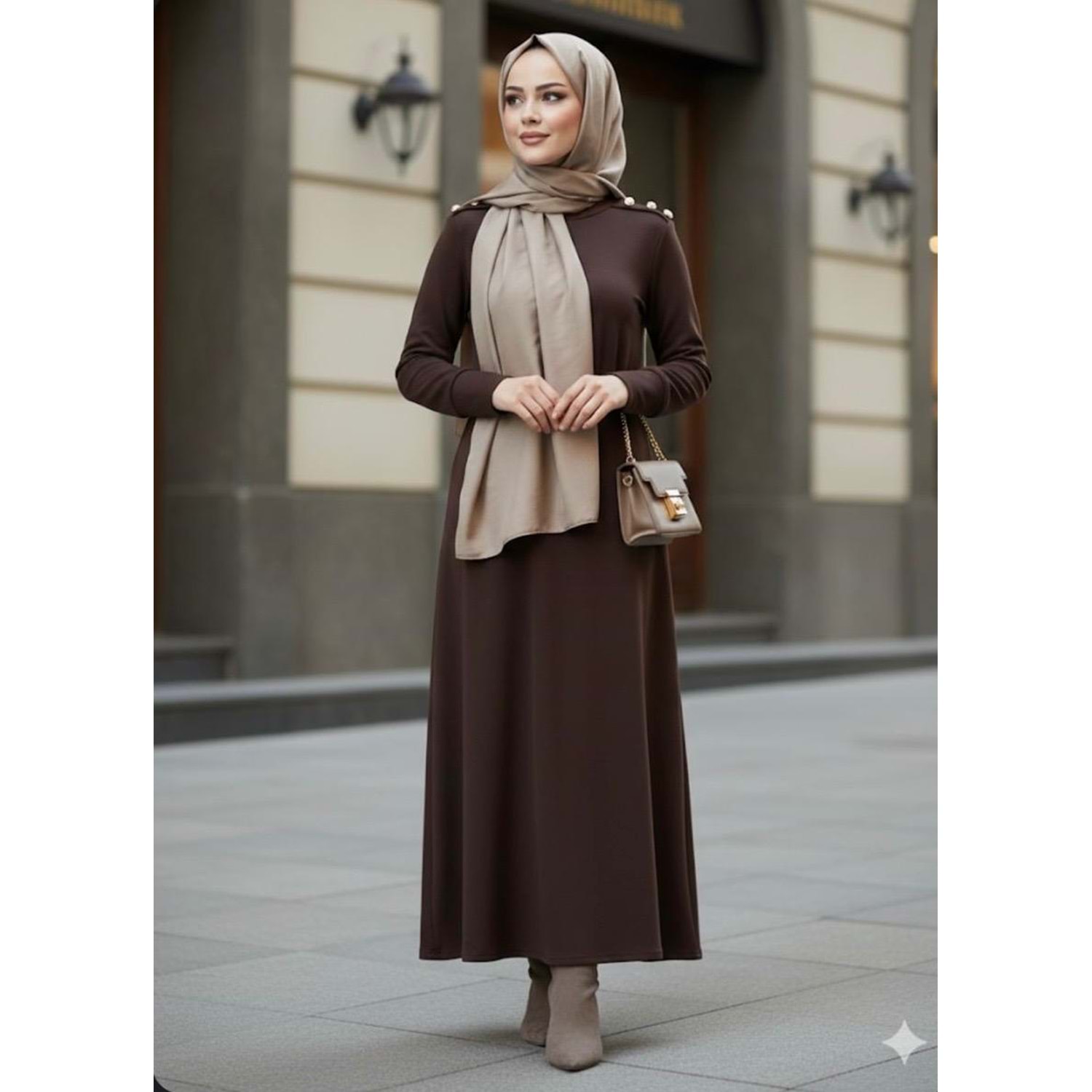 Omuzu Düğmeli Elbise 1087 - Acı Kahve - M