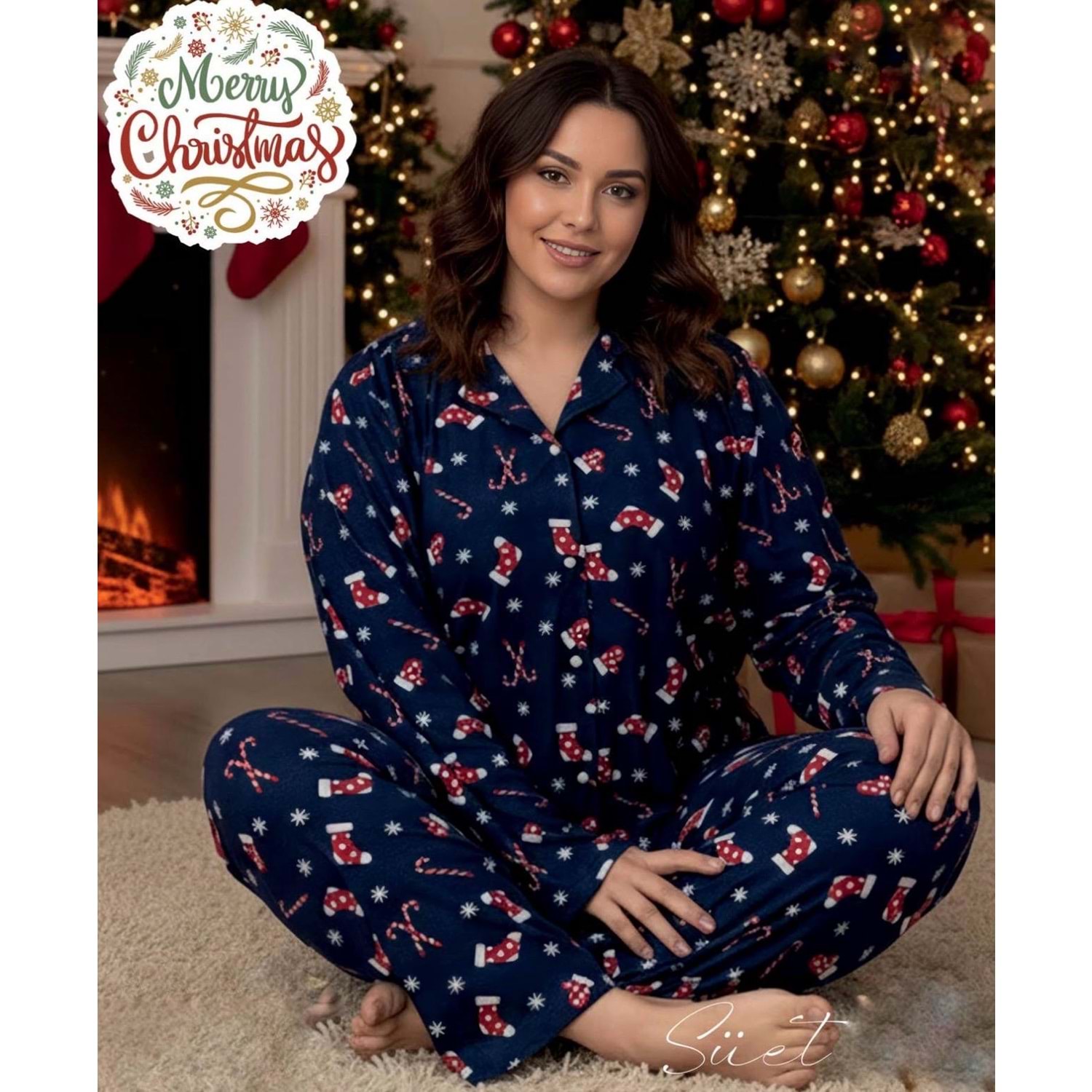 Kalp ve Baston Detaylı Pijama Takımı 1623 - Lacivert - XXL