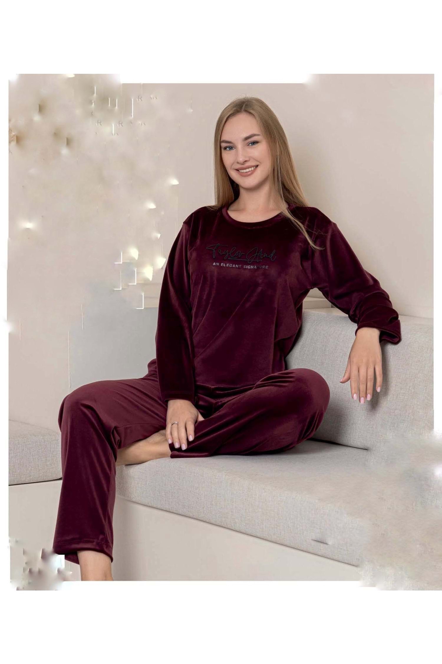 Yazı Baskılı Kadife Pijama Takımı 1827 - Bordo - L - AZRA06991-56225