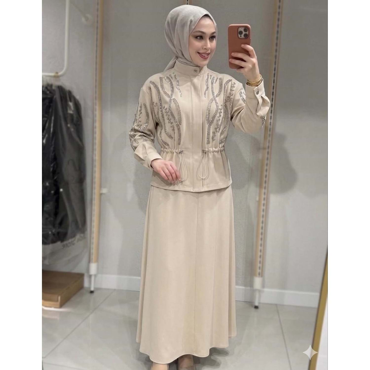 Boncuk İşlemeli Etekli Takım 1492 - Bej - S-M