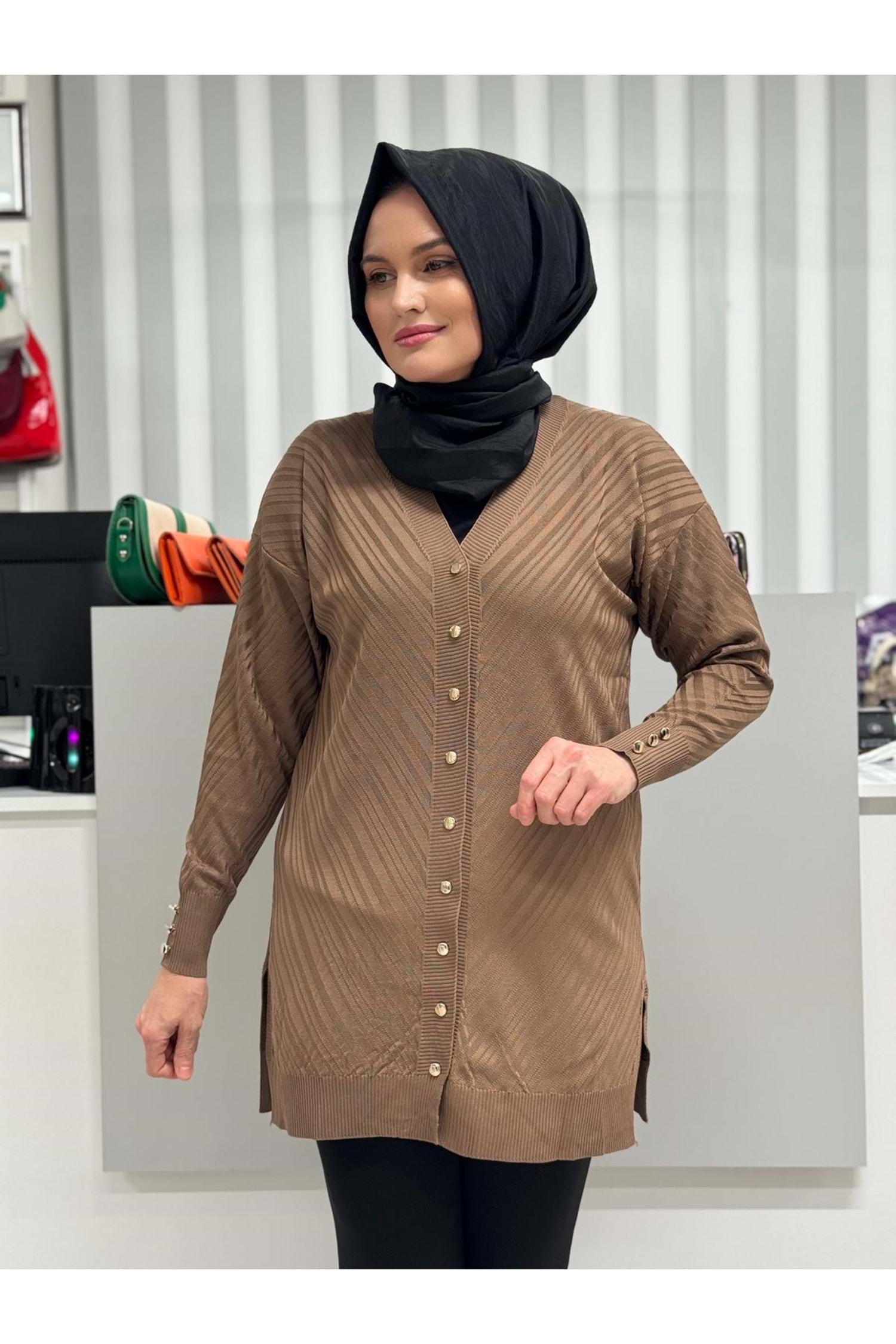 Çapraz Desenli Merserize Hırka 3198 - Kahve Rengi - TEK BEDEN