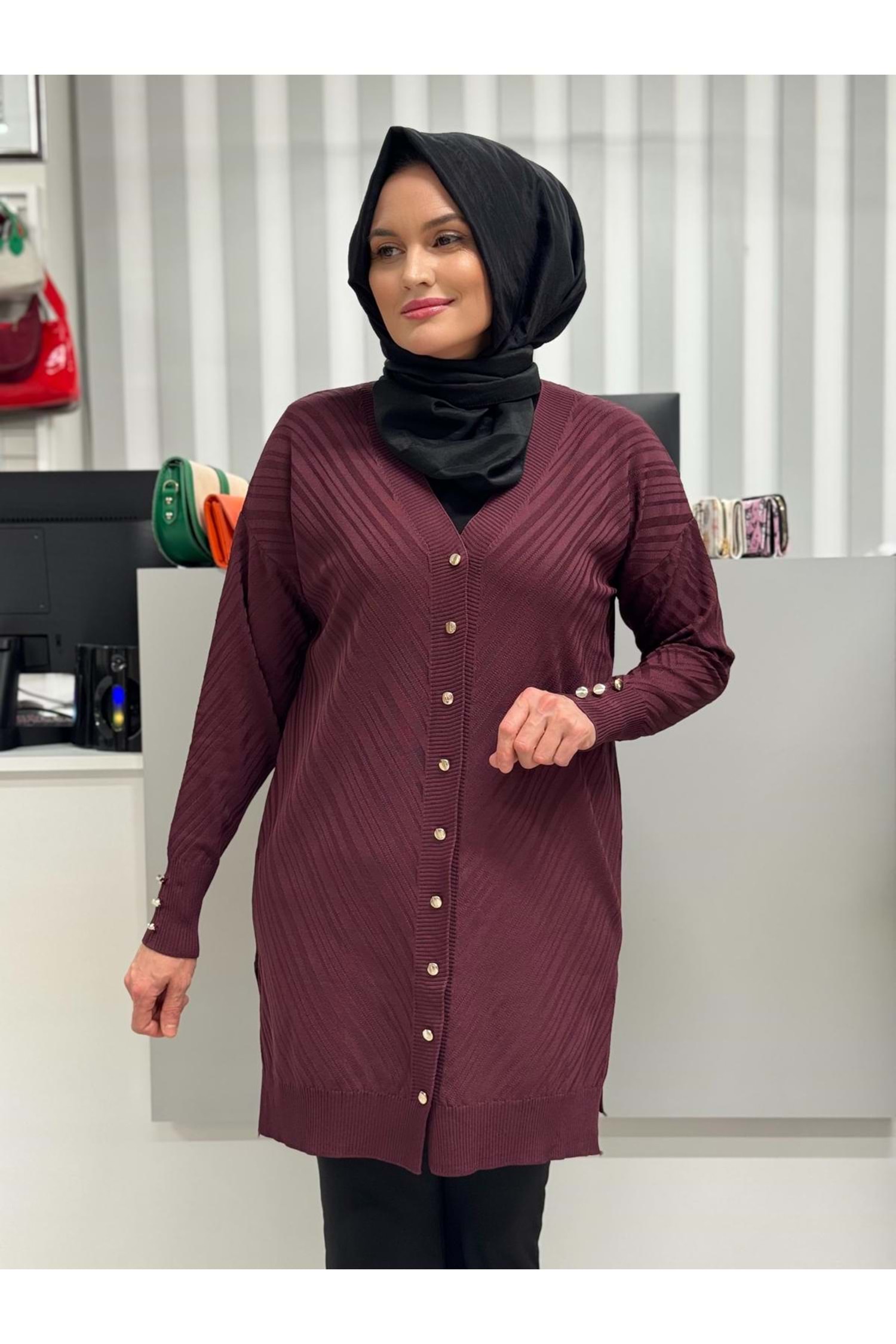 Çapraz Desenli Merserize Hırka 3198 - Mürdüm - TEK BEDEN