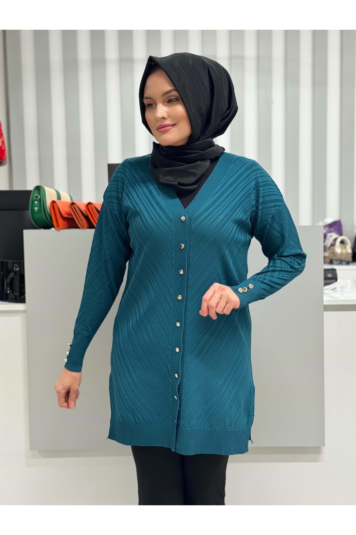 Çapraz Desenli Merserize Hırka 3198 - Petrol Mavi - TEK BEDEN