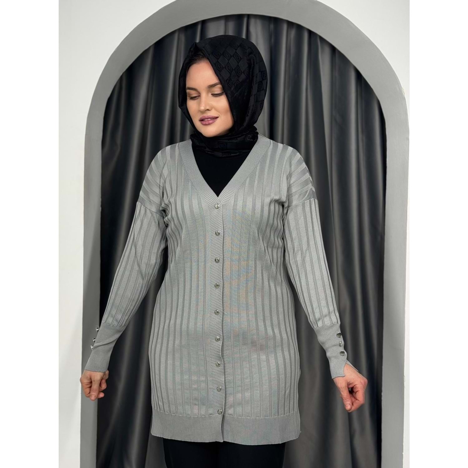 Çizgili Merserize Hırka 3179 - Gri - TEK BEDEN - AZRA05355-44651