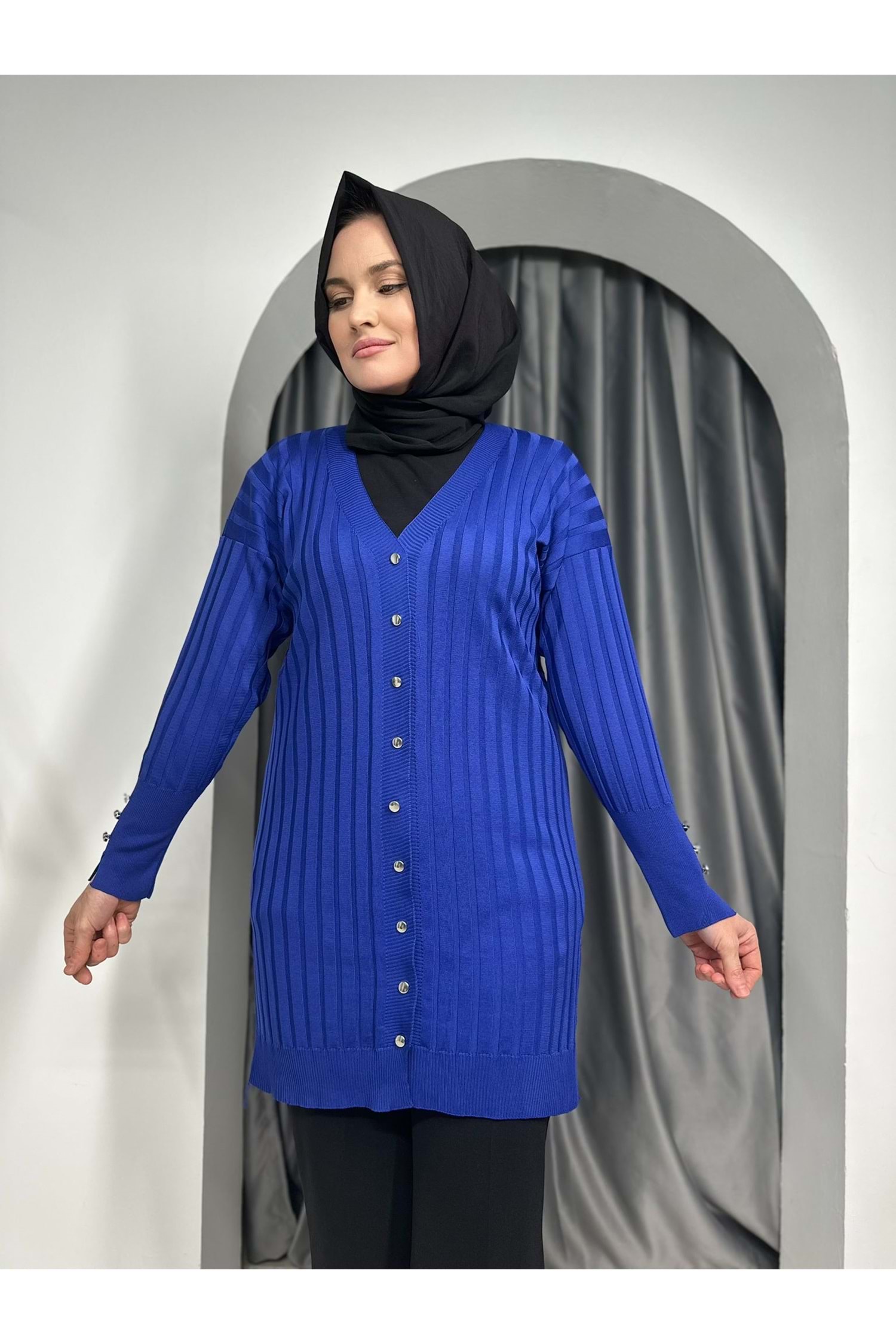 Çizgili Merserize Hırka 3179 - Saks Mavi - TEK BEDEN - AZRA05355-45146