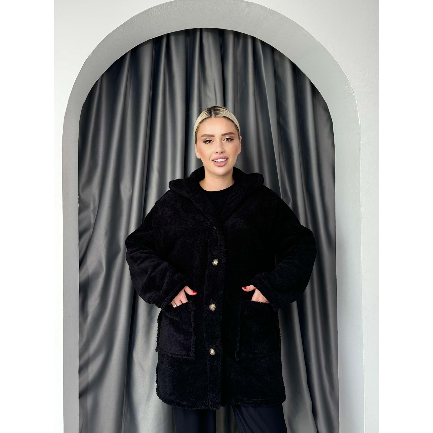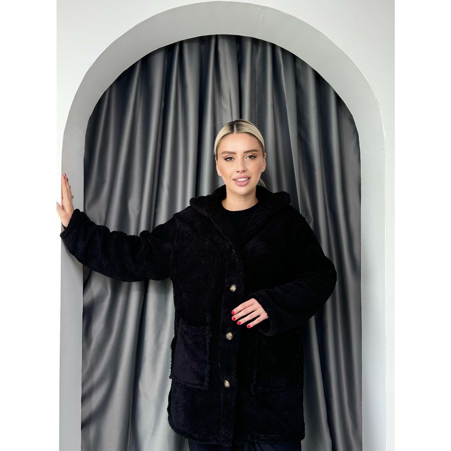 Düğmeli Büyük Cepli Welsoft Hırka 2774 - Siyah - TEK BEDEN - AZRA05036-Siyah-TEK BEDEN