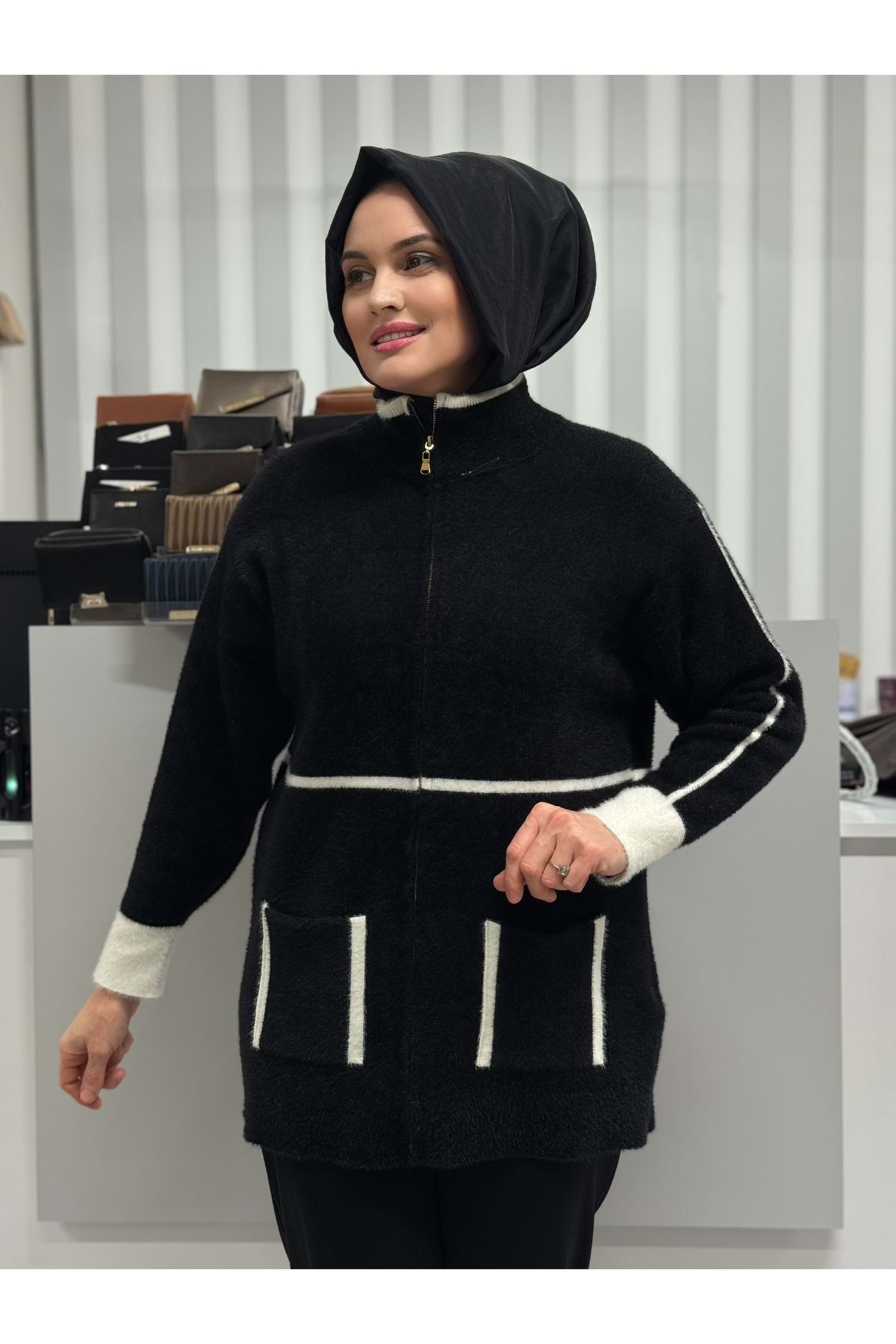 Fermuarlı Angora Hırka 25027 - Siyah - TEK BEDEN - AZRA07372-Siyah-TEK BEDEN