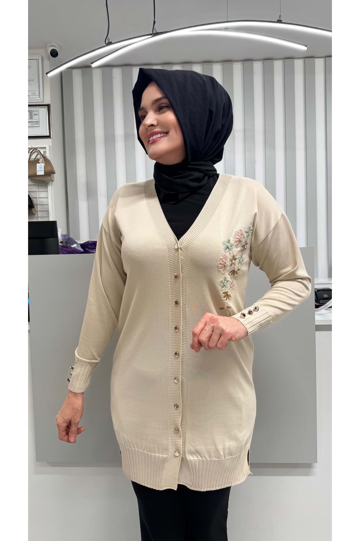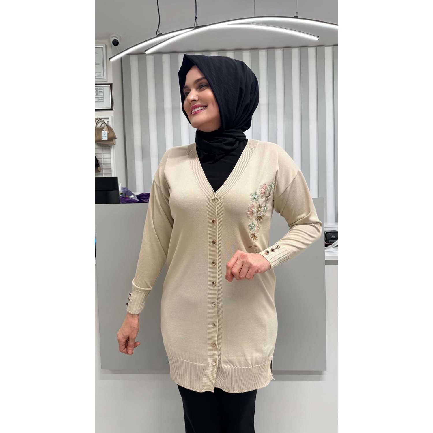 Taşlı Çiçek Desenli Merserize Hırka 3280 - Bej - TEK BEDEN - AZRA07082-56785