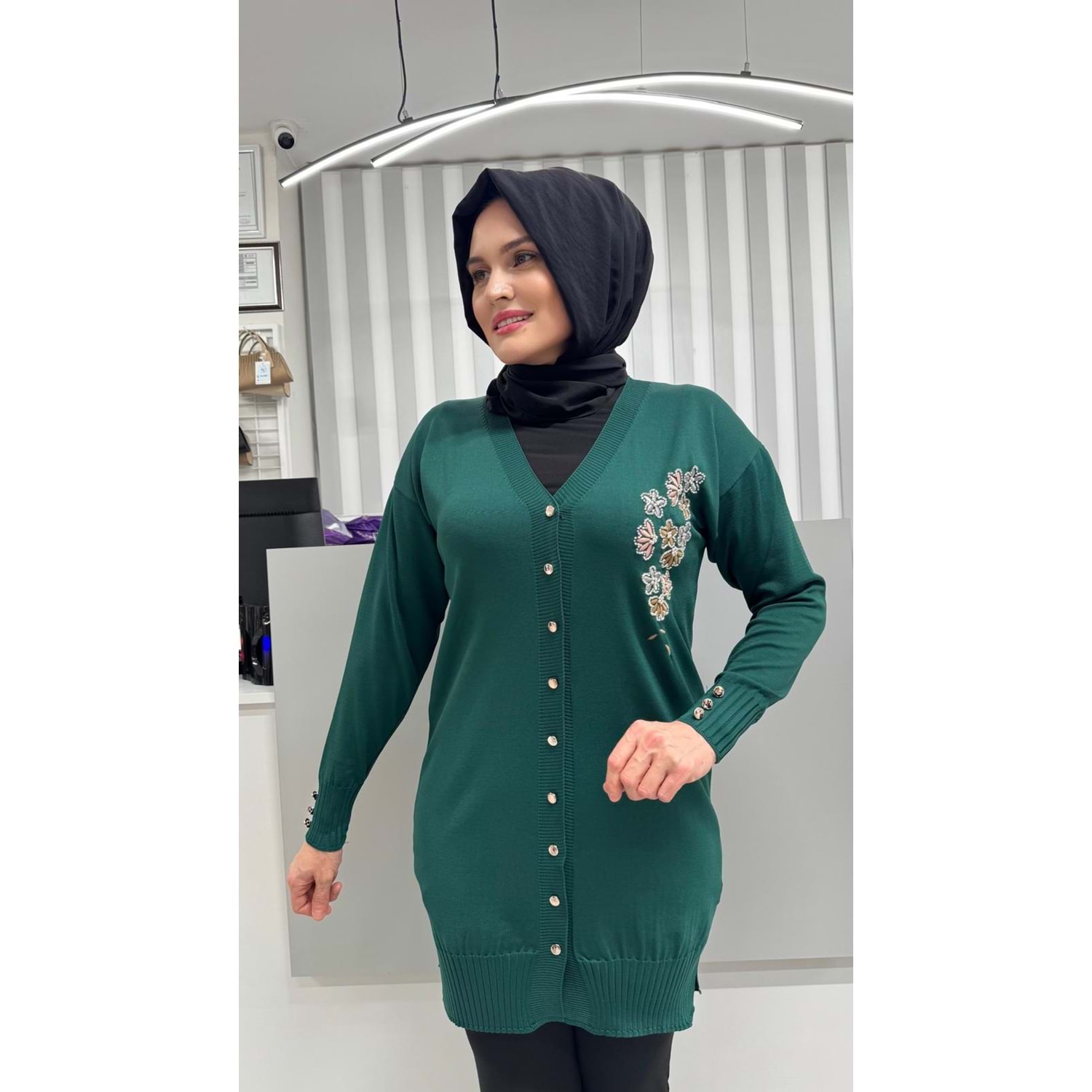 Taşlı Çiçek Desenli Merserize Hırka 3280 - Zümrüt Yeşili - TEK BEDEN - AZRA07082-56792
