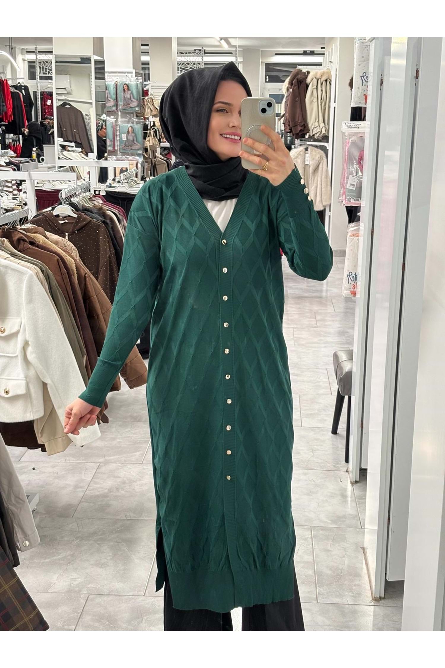 Uzun Baklava Desen Hırka 3295 - Zümrüt Yeşili - TEK BEDEN - AZRA07491-59201