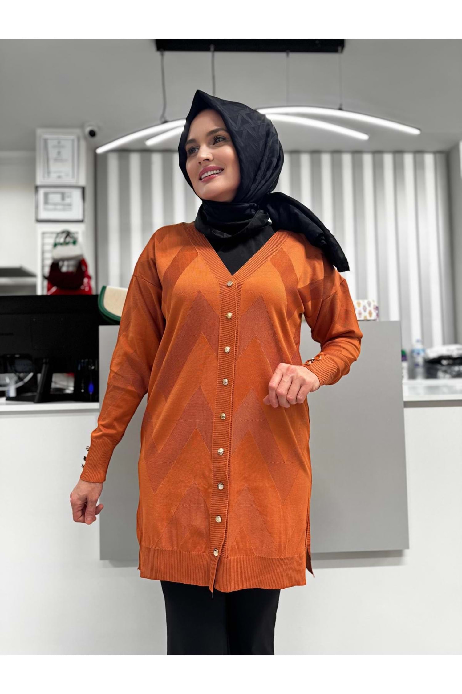 Zikzak Desenli Merserize Hırka 1420 - Turuncu - TEK BEDEN