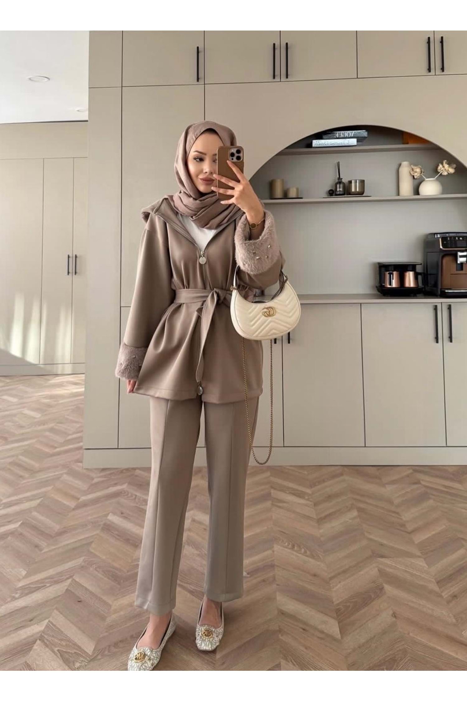 Kol Ucu Ve Yakası Tüylü Takım 2089 - Vizon - S-M