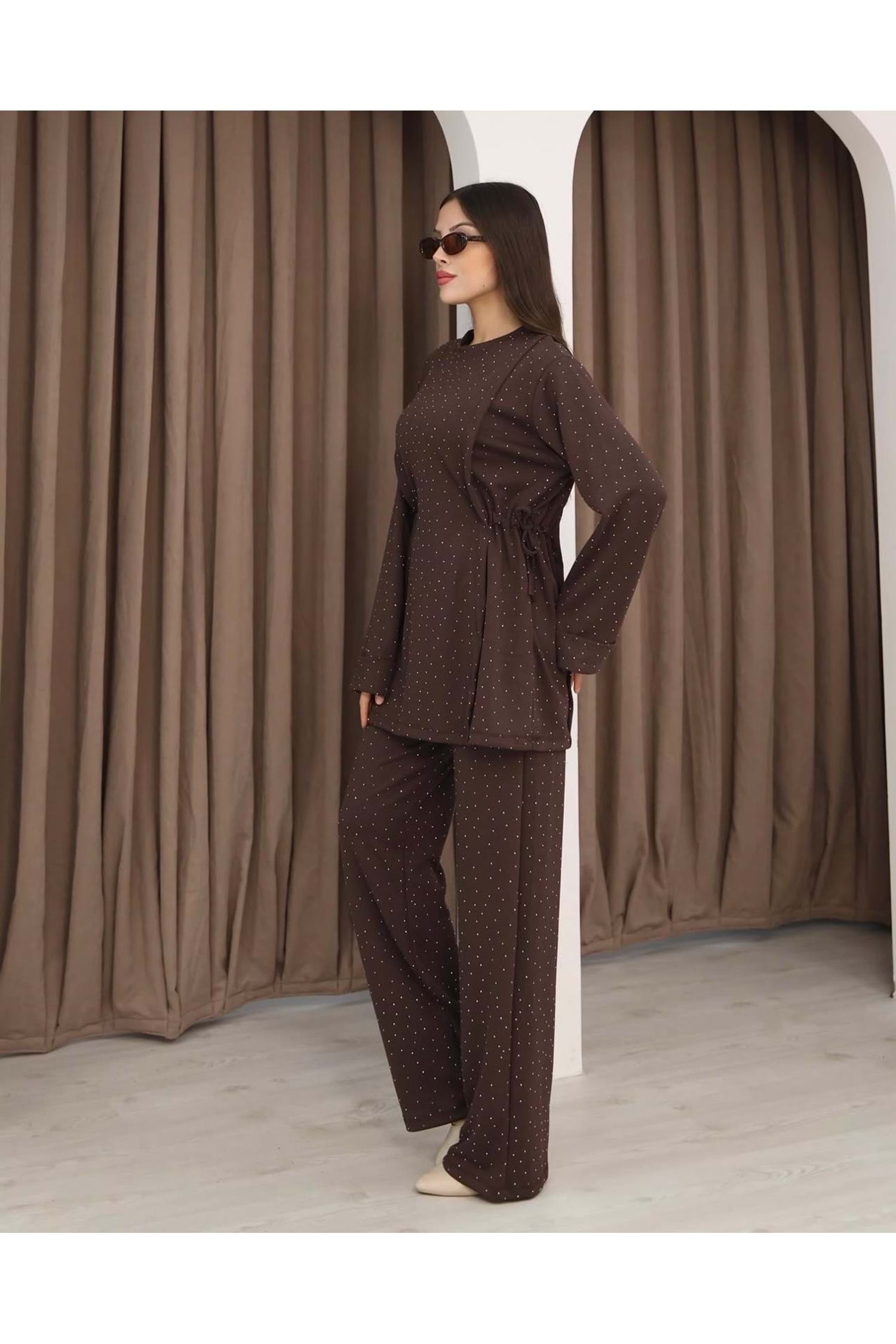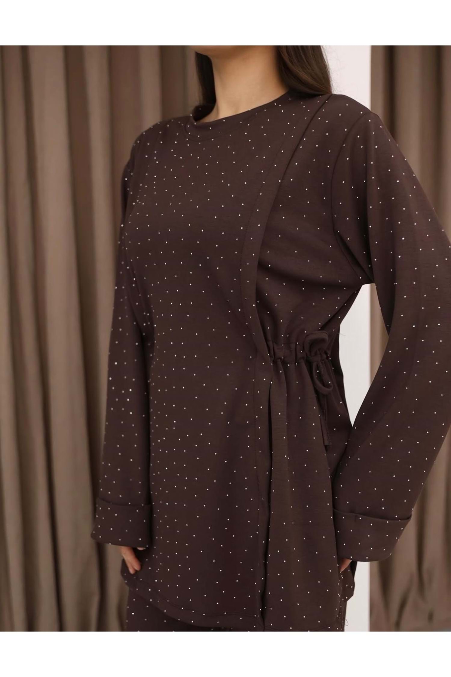 Oyşo Kumaş Yanları Büzgülü Taşlı Takım 26215 - Kahve Rengi - S