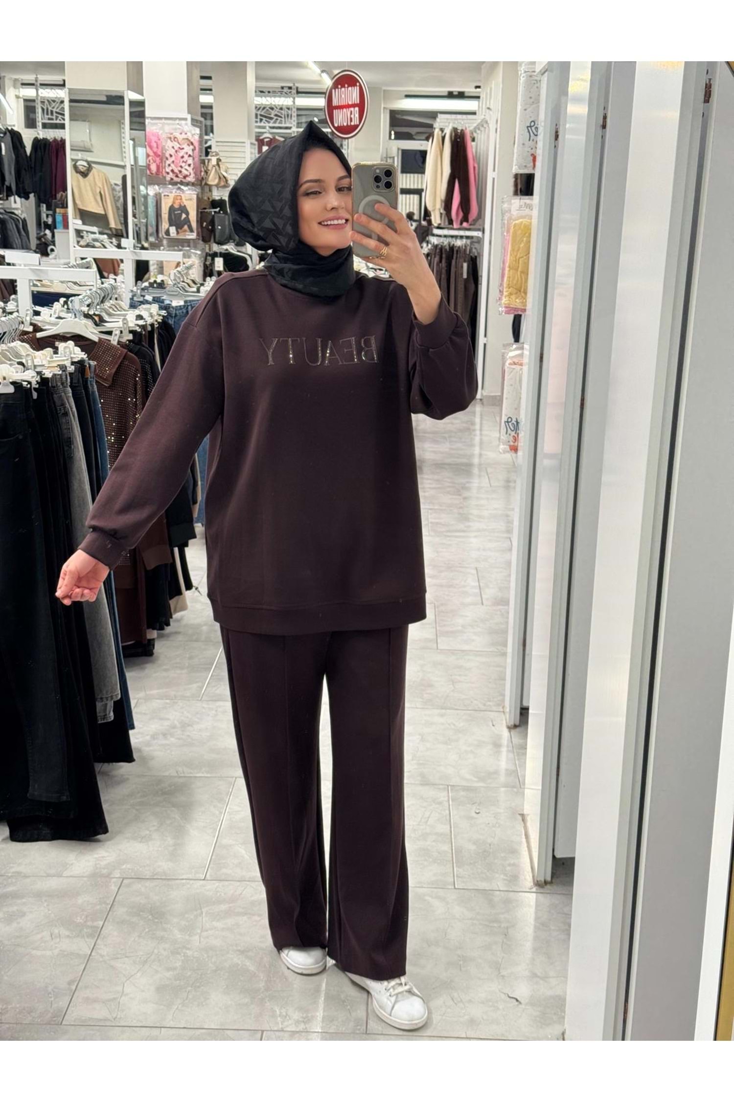 Tona Ton Baskı Ve Taşlı Takım 35790 - Acı Kahve - M - AZRA07386-Acı Kahve-M
