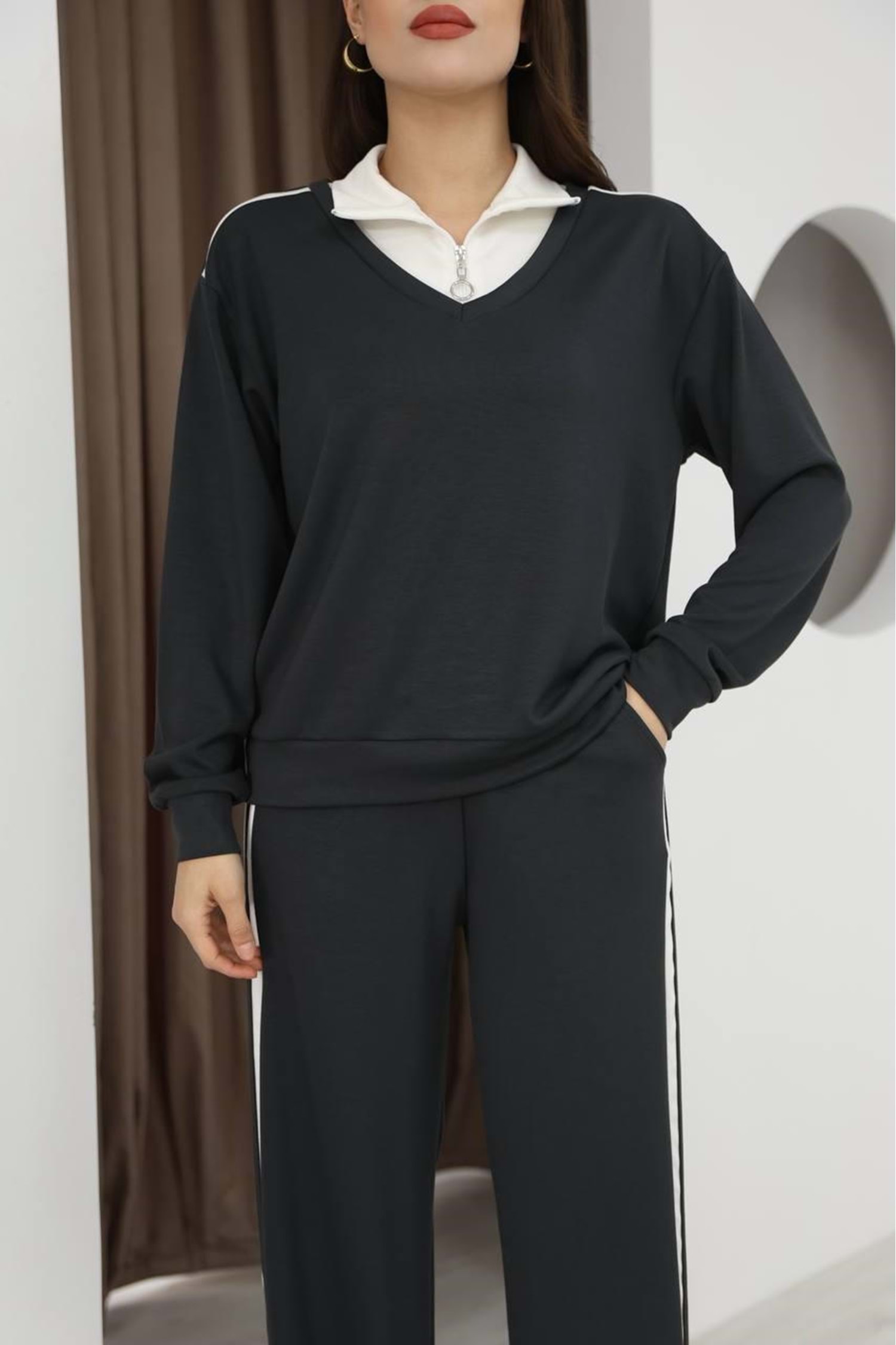 Yaka Fermuar Detaylı Garnili Takım 26227 - Füme - L - AZRA07146-57439