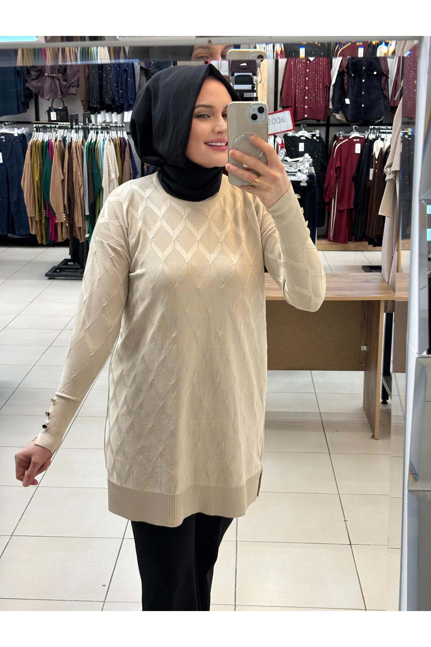 Baklavalı Merserize Tunik 3288 - Bej - TEK BEDEN - AZRA07490-59184