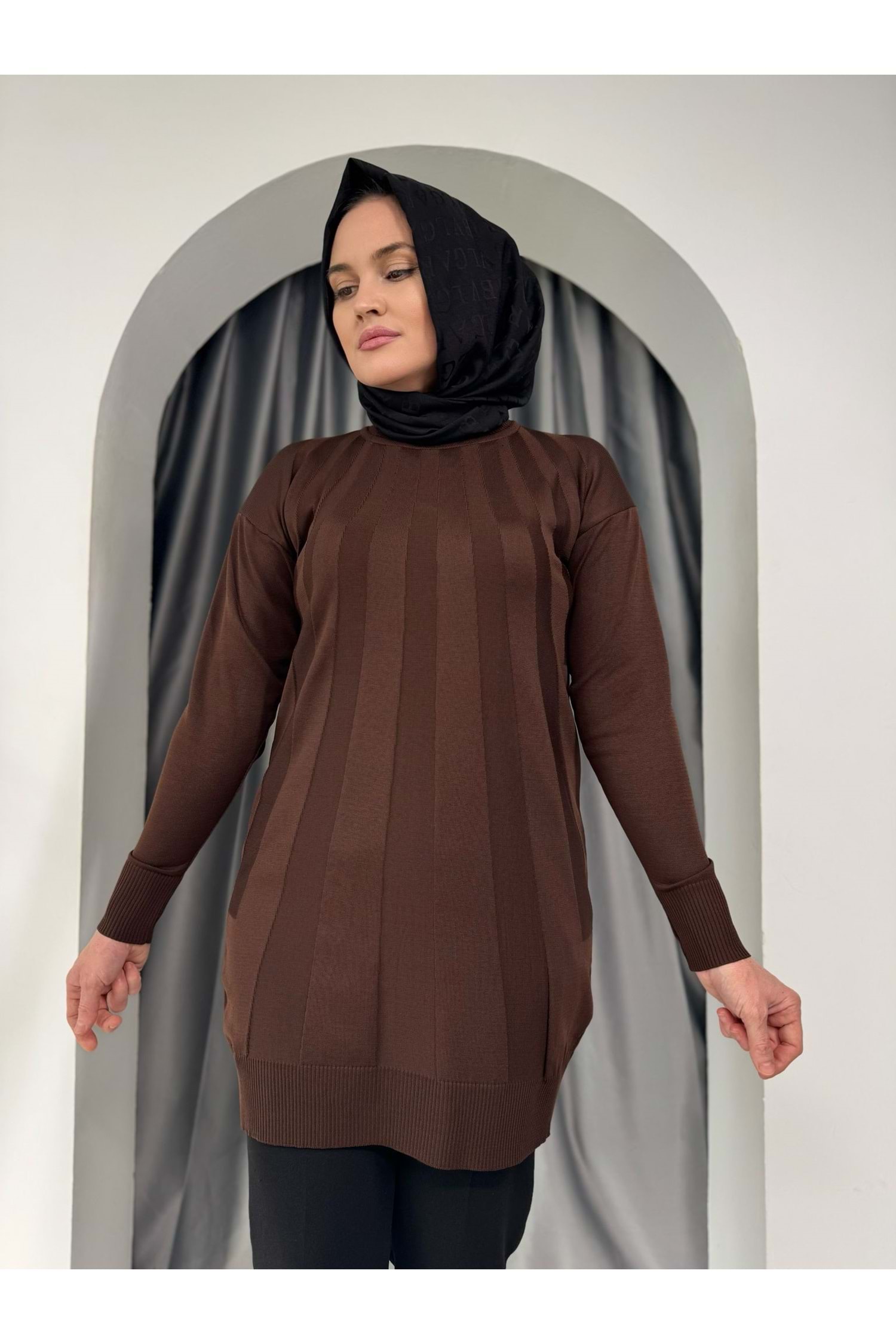 Büyük Şeritli Merserize Tunik 3190 - Acı Kahve - TEK BEDEN - AZRA05422-45445