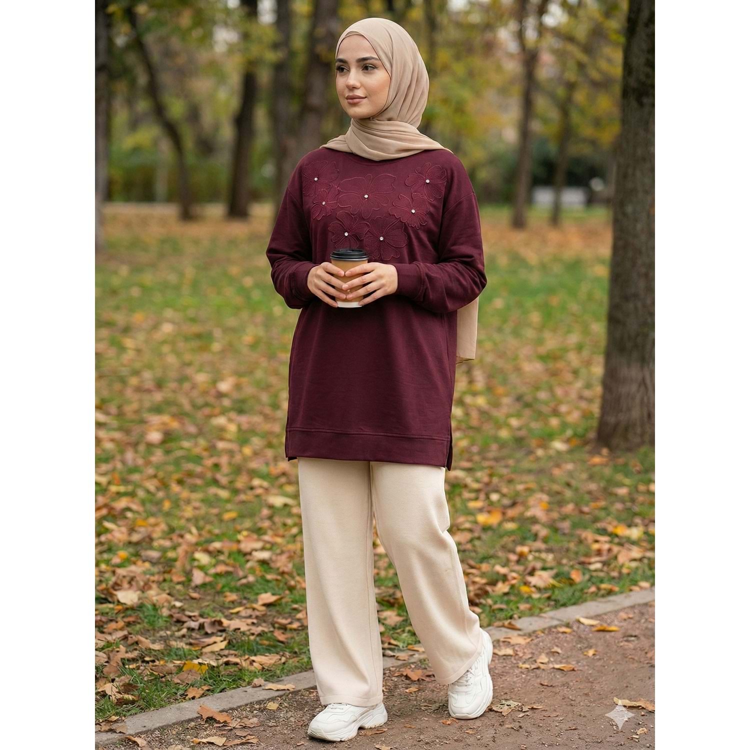 Çiçek Nakışlı Taş Detaylı Tunik 26810 - Bordo - L