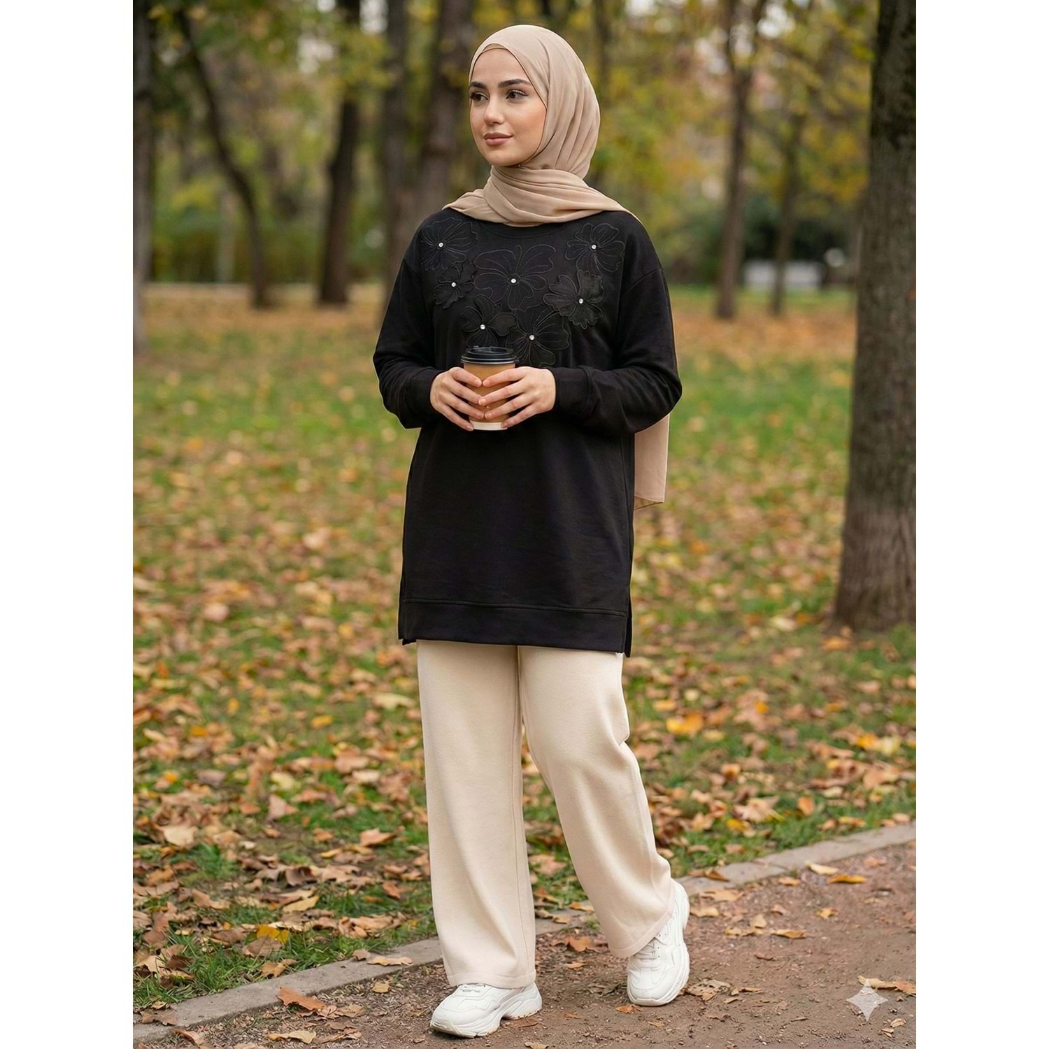 Çiçek Nakışlı Taş Detaylı Tunik 26810 - Siyah - XL
