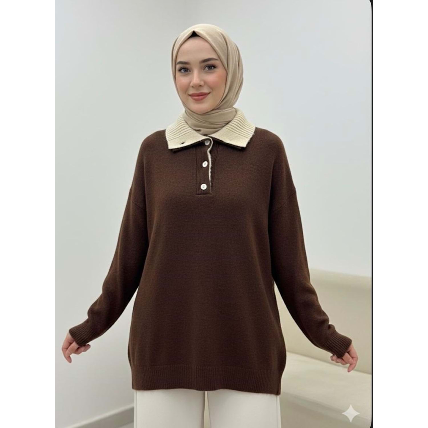 Çift Yakalı Triko Tunik 25043 - Acı Kahve - TEK BEDEN - AZRA07456-Acı Kahve-TEK BEDEN