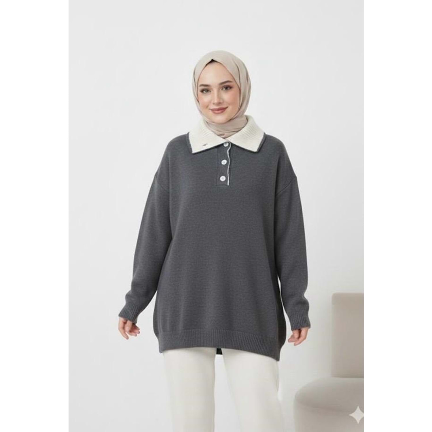 Çift Yakalı Triko Tunik 25043 - Antrasit - TEK BEDEN - AZRA07456-Antrasit-TEK BEDEN