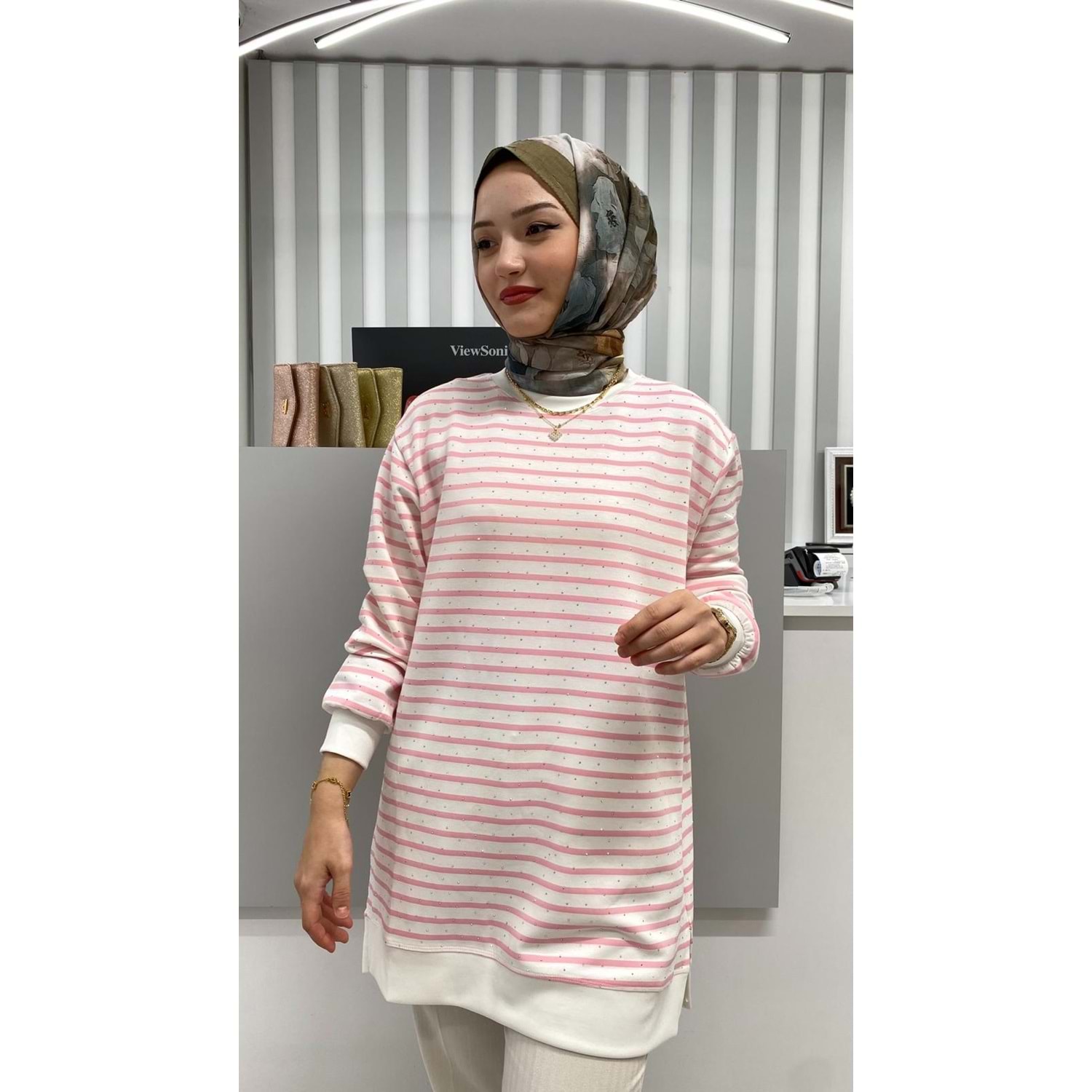 Taşlı Çizgili Tunik 26162 - Pembe - M