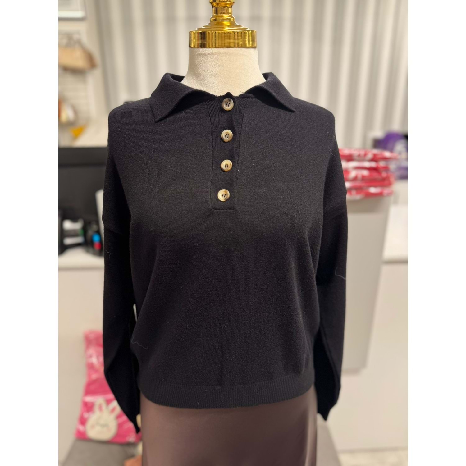 Yakalı Düğmeli Kazak 12325 - Siyah - TEK BEDEN - AZRA07253-Siyah-TEK BEDEN