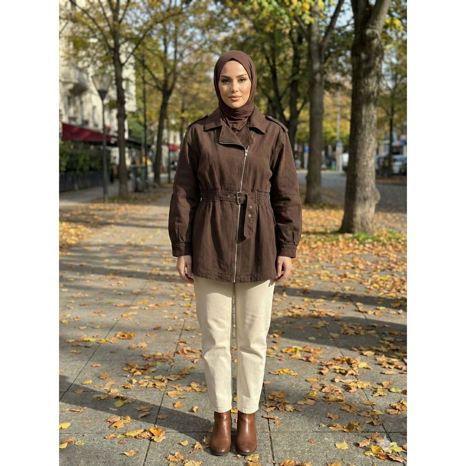 MGZN Beli Büzgülü Denim Ceket 7306 - Kahve Rengi - TEK BEDEN - AZRA07701-60174