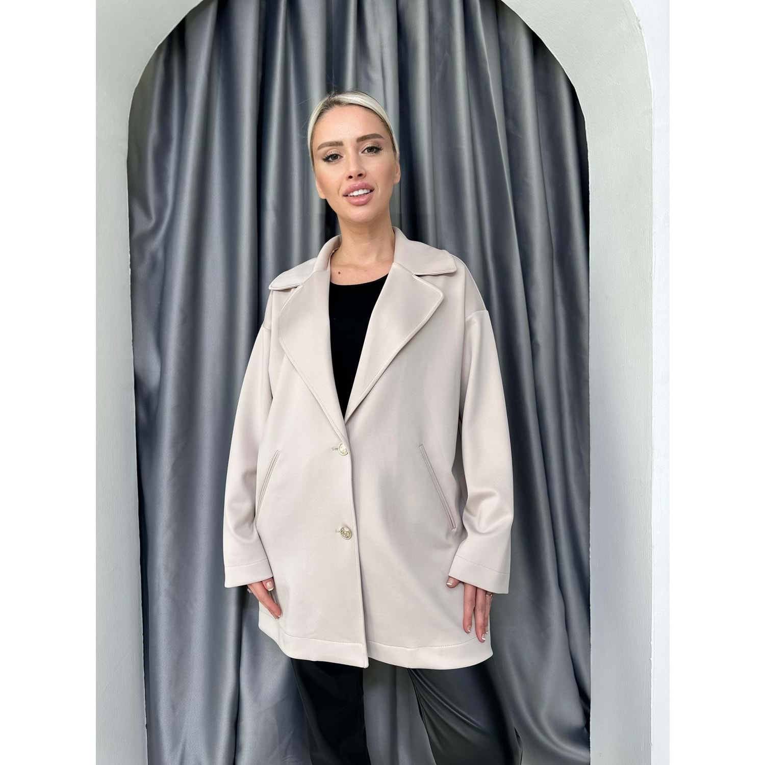 Oversize Basic Ceket 33695 - Bej - TEK BEDEN - AZRA04999-Bej-TEK BEDEN