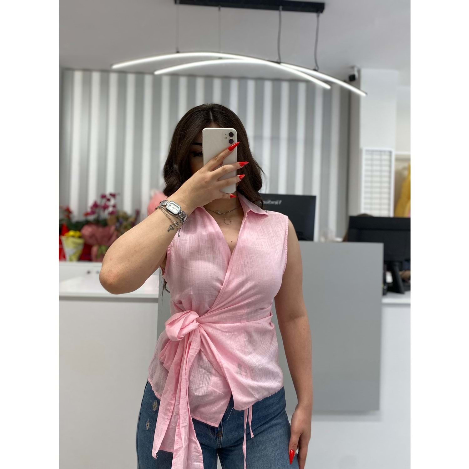 Bağlamalı Keten Kumaş Gömlek 10111 - Pembe - M - AZRA05850-48275