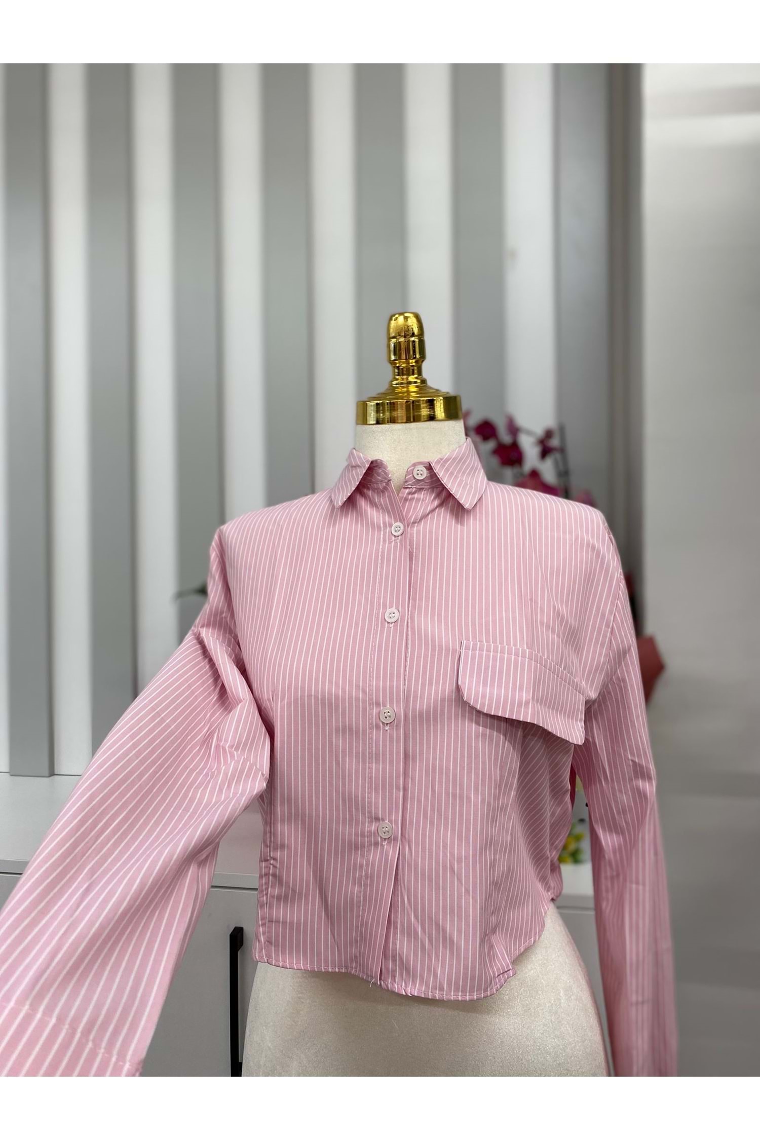 Çizgili Kısa Crop Gömlek 007025 - Pembe - M - AZRA05814-47909