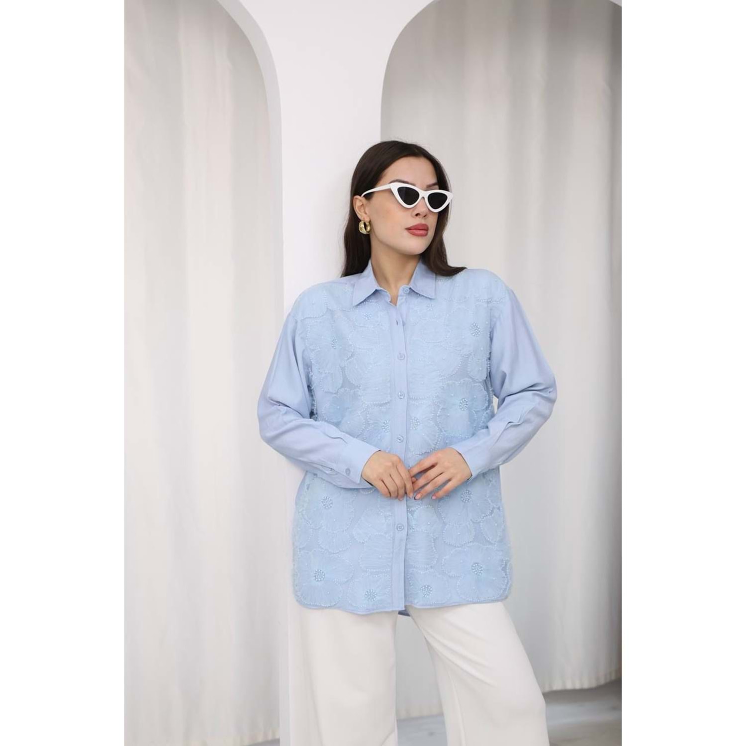 İşlemeli Dantel Detaylı Çiçekli Gömlek 26589 - Mavi - L - AZRA07793-60943