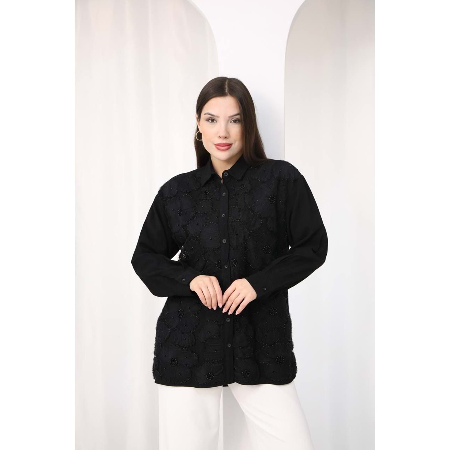 İşlemeli Dantel Detaylı Çiçekli Gömlek 26589 - Siyah - L - AZRA07793-60951