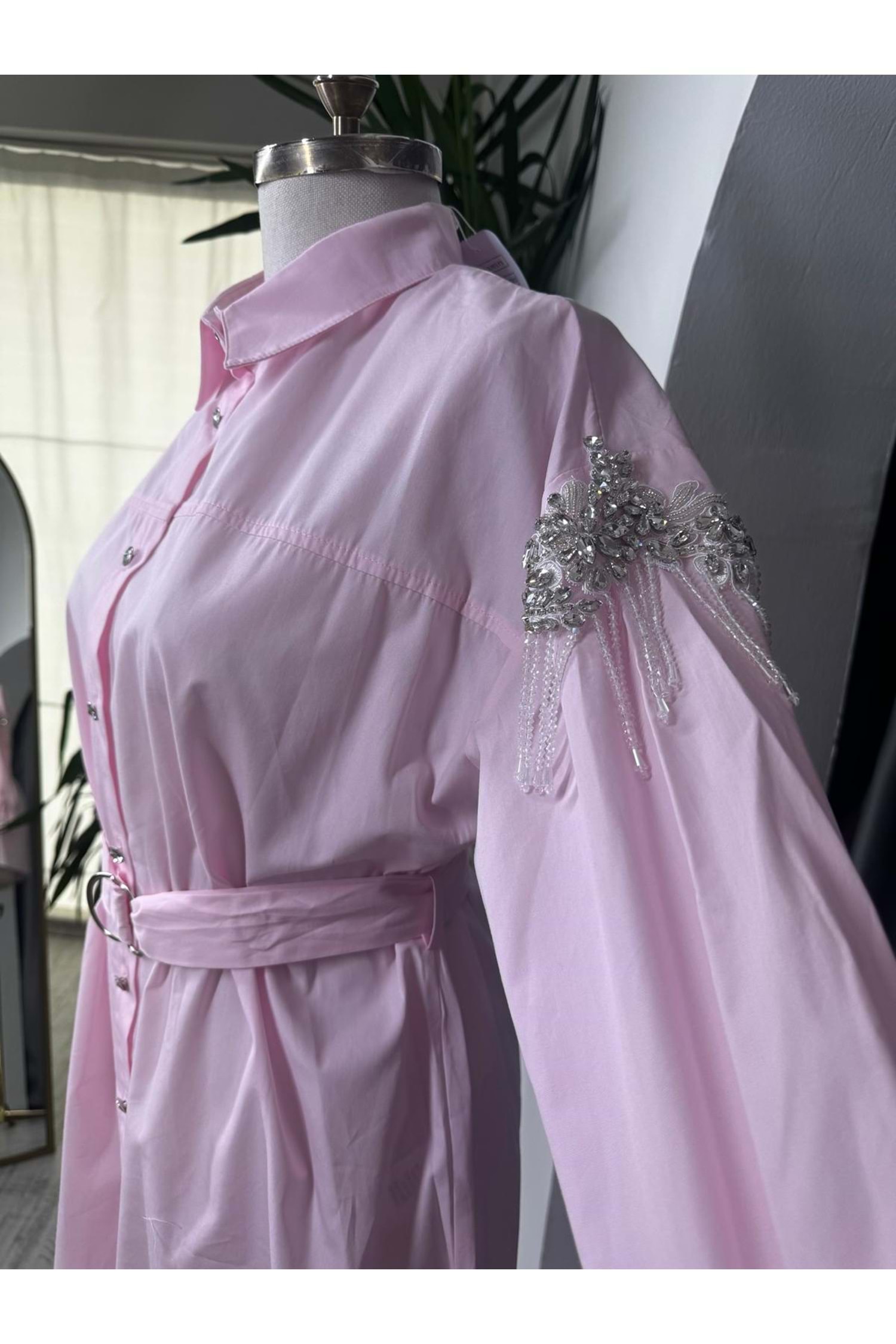 Kolları Taşlı Beli Kemerli Gömlek 170171 - Pembe - TEK BEDEN - AZRA05723-47207
