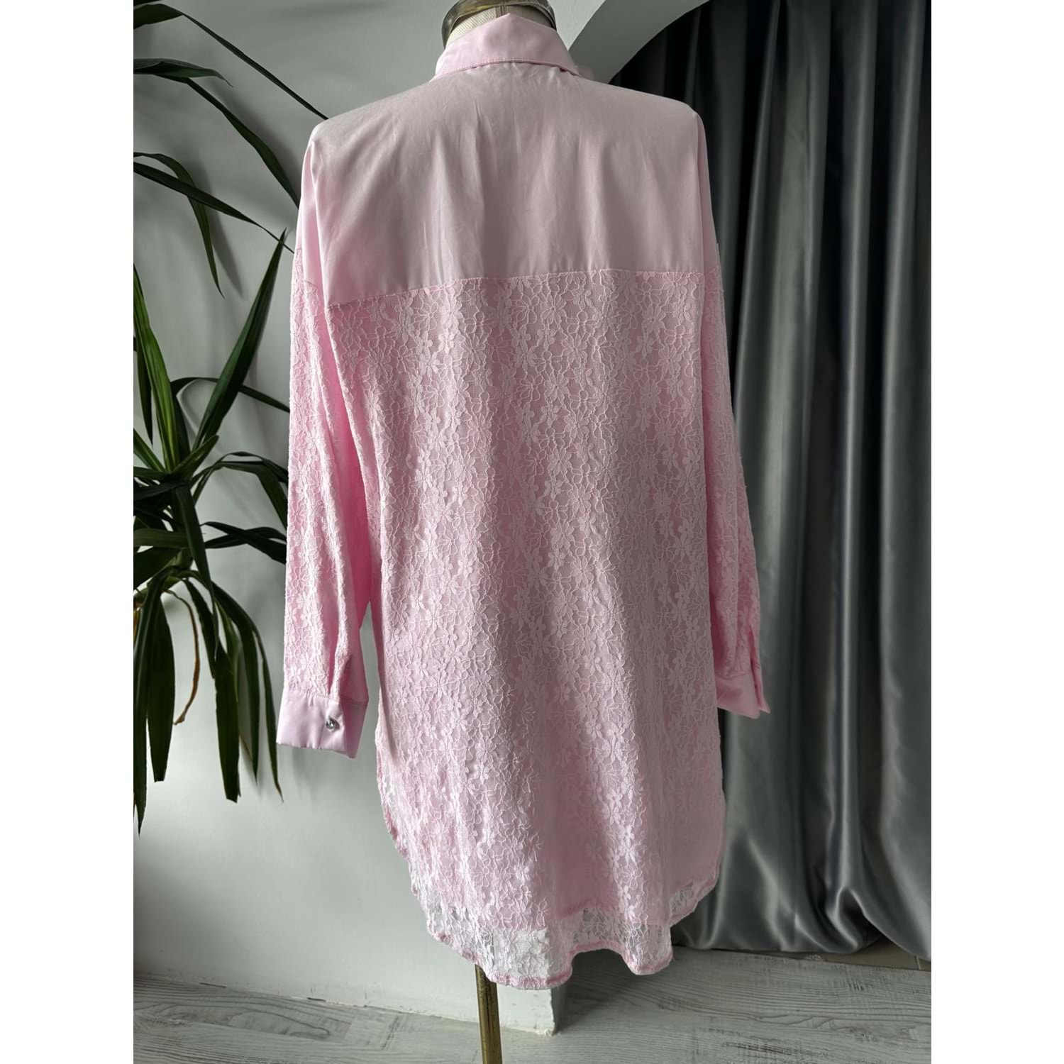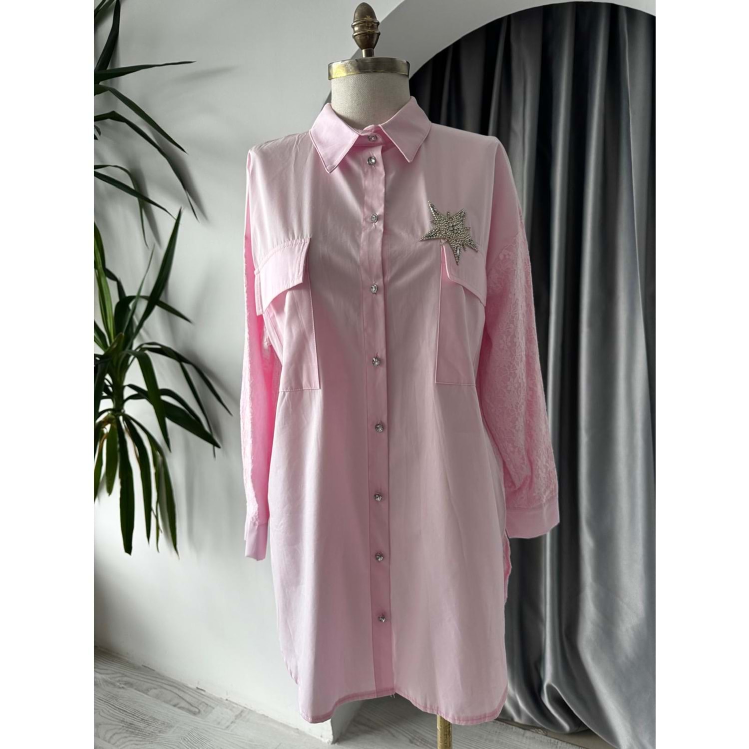 Yıldız Taşlı Kolları Güpürlü Gömlek 170179 - Pembe - TEK BEDEN - AZRA05739-47303