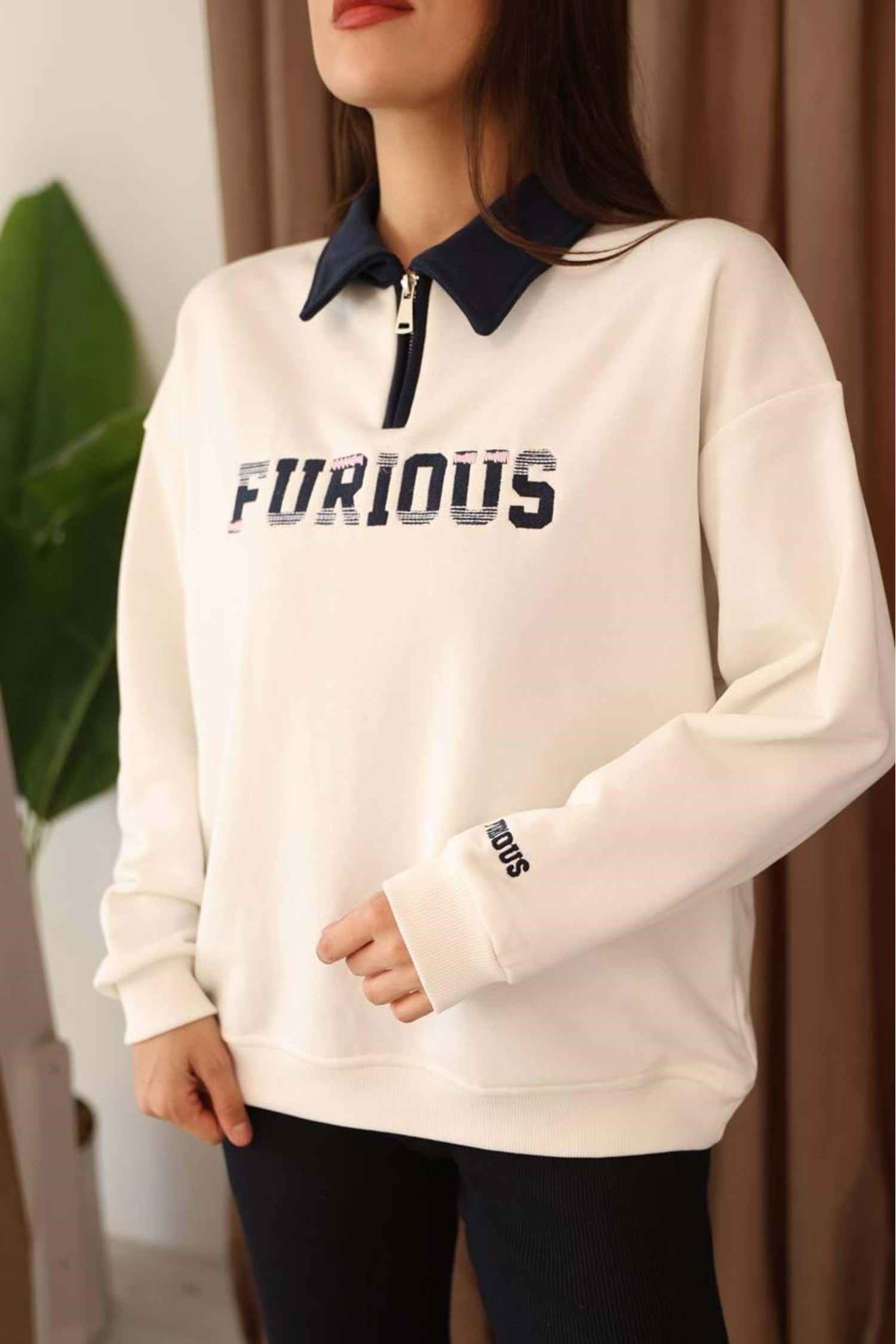 Fermuar Detaylı Önü Nakışlı Sweat 26199 - Beyaz - L-XL