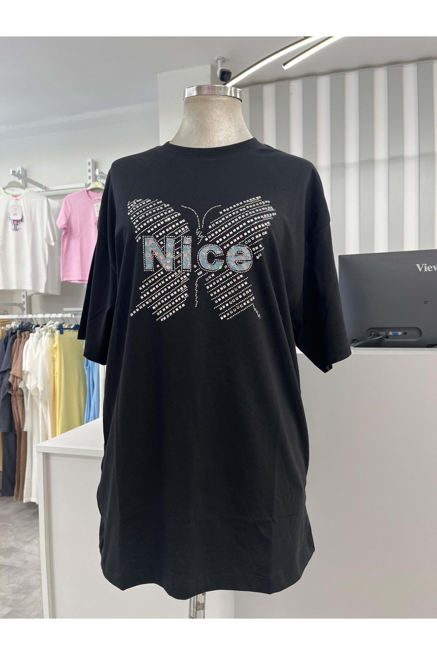 Kelebek Taşlı Tişört 251081 - Siyah - S