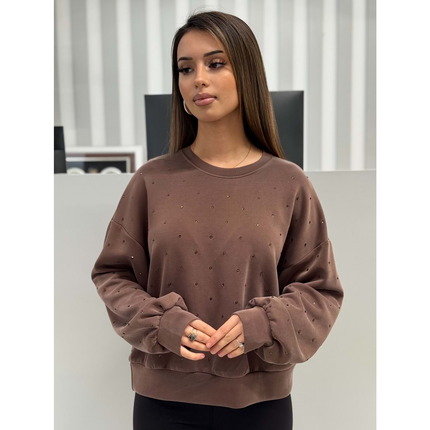 Taş Baskılı Modal Tişört 5386 - Kahve Rengi - L - AZRA06842-55486