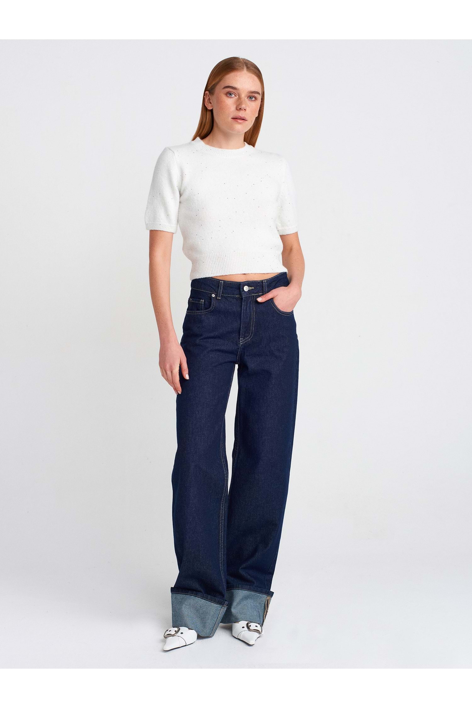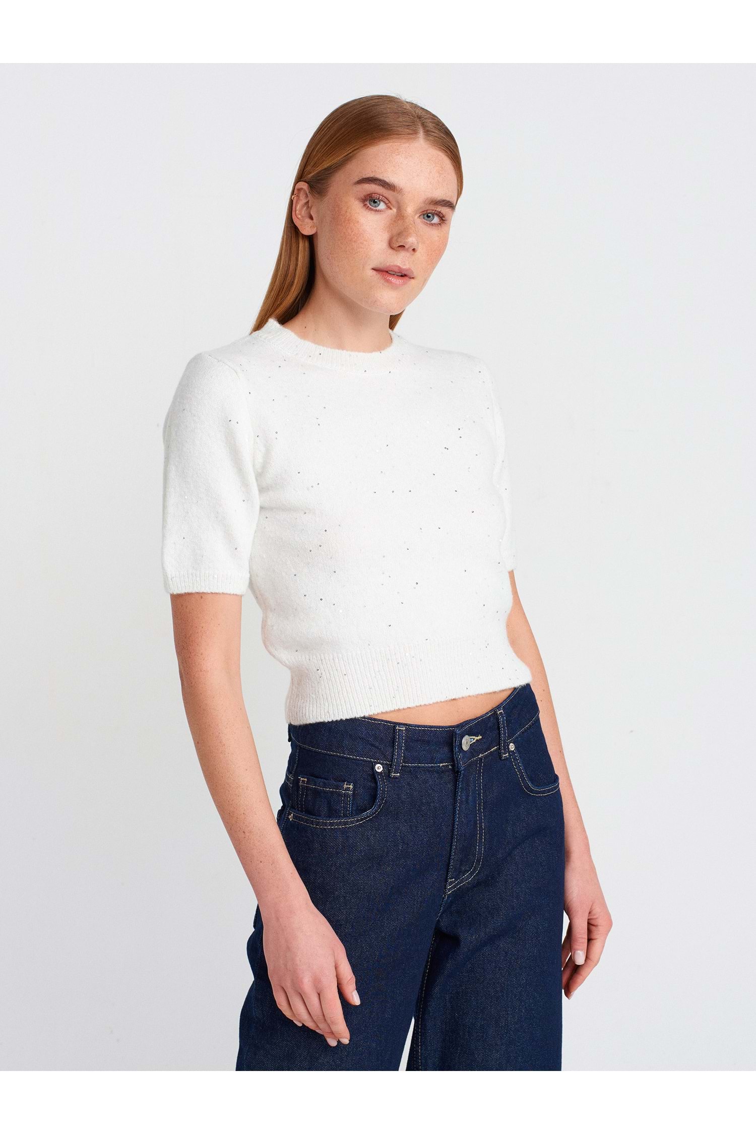 Bisiklet Yaka Pullu Simli Triko Kazak 10703 - Ekru - TEK BEDEN