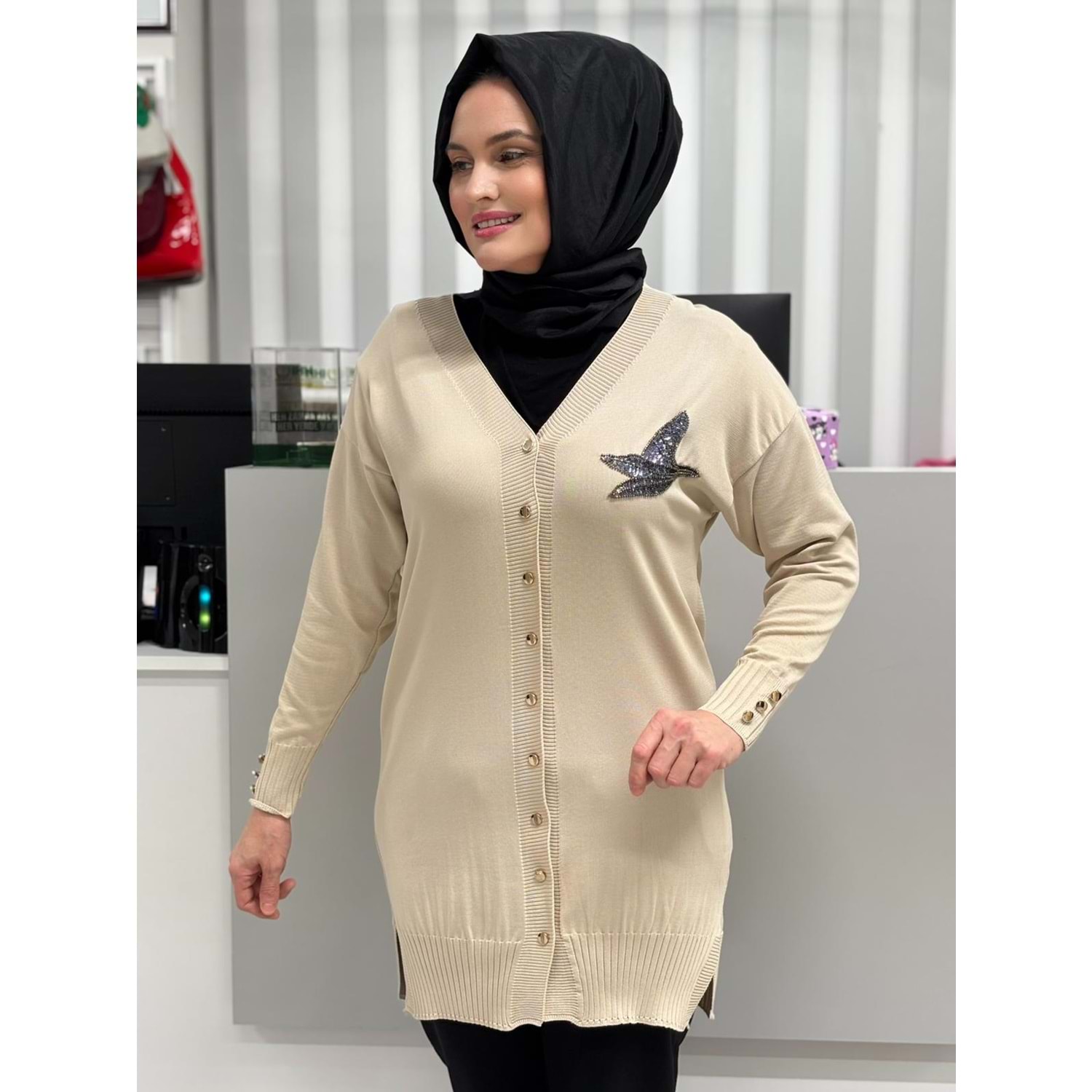 Pullu Taşlı Yanı Kuşlu Merserize Hırka 3207 - Bej - TEK BEDEN - AZRA06966-56089