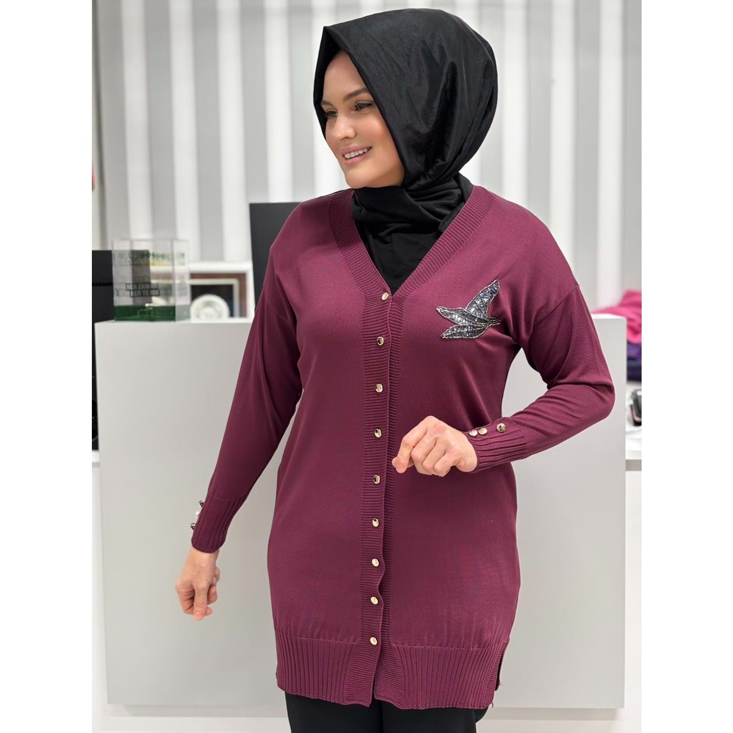 Pullu Taşlı Yanı Kuşlu Merserize Hırka 3207 - Mürdüm - TEK BEDEN - AZRA06966-56092